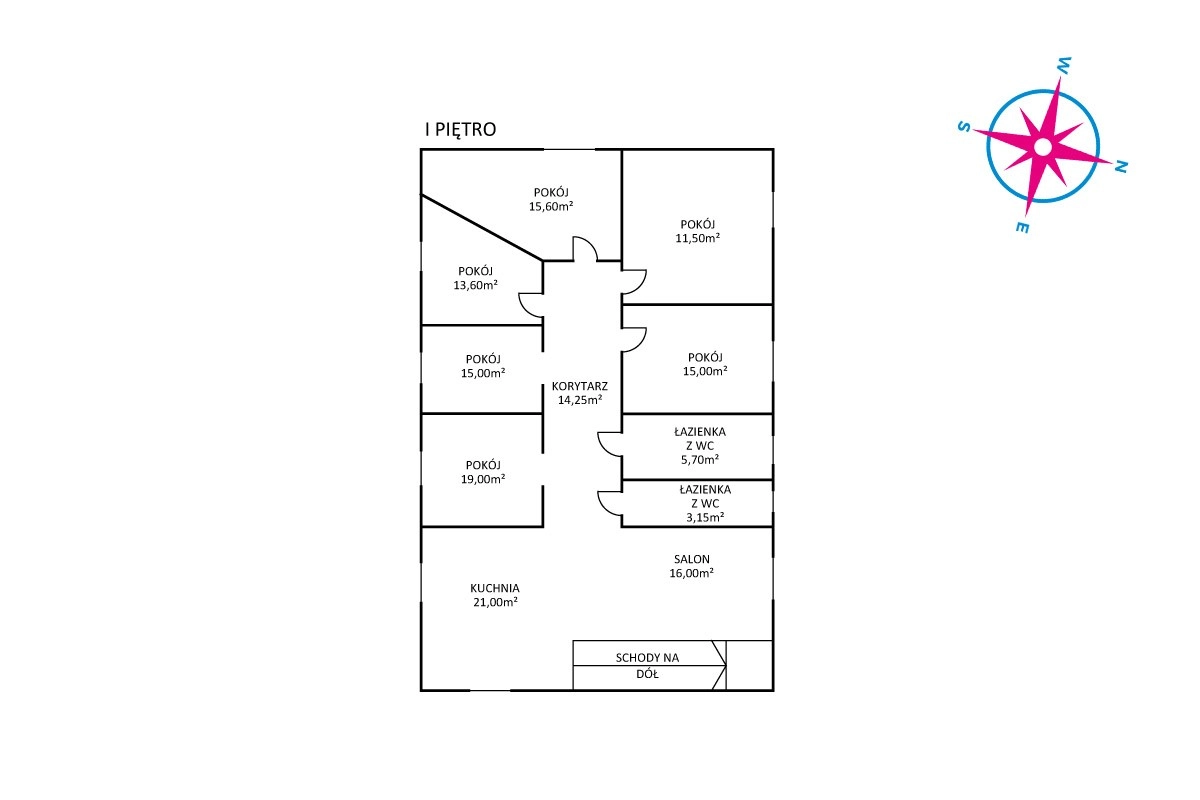 – 6x pokój (19 m2 / 15 m2 / 13,6 m2 / 15,6 m2 / 11,5 m2 / 15 m2)
