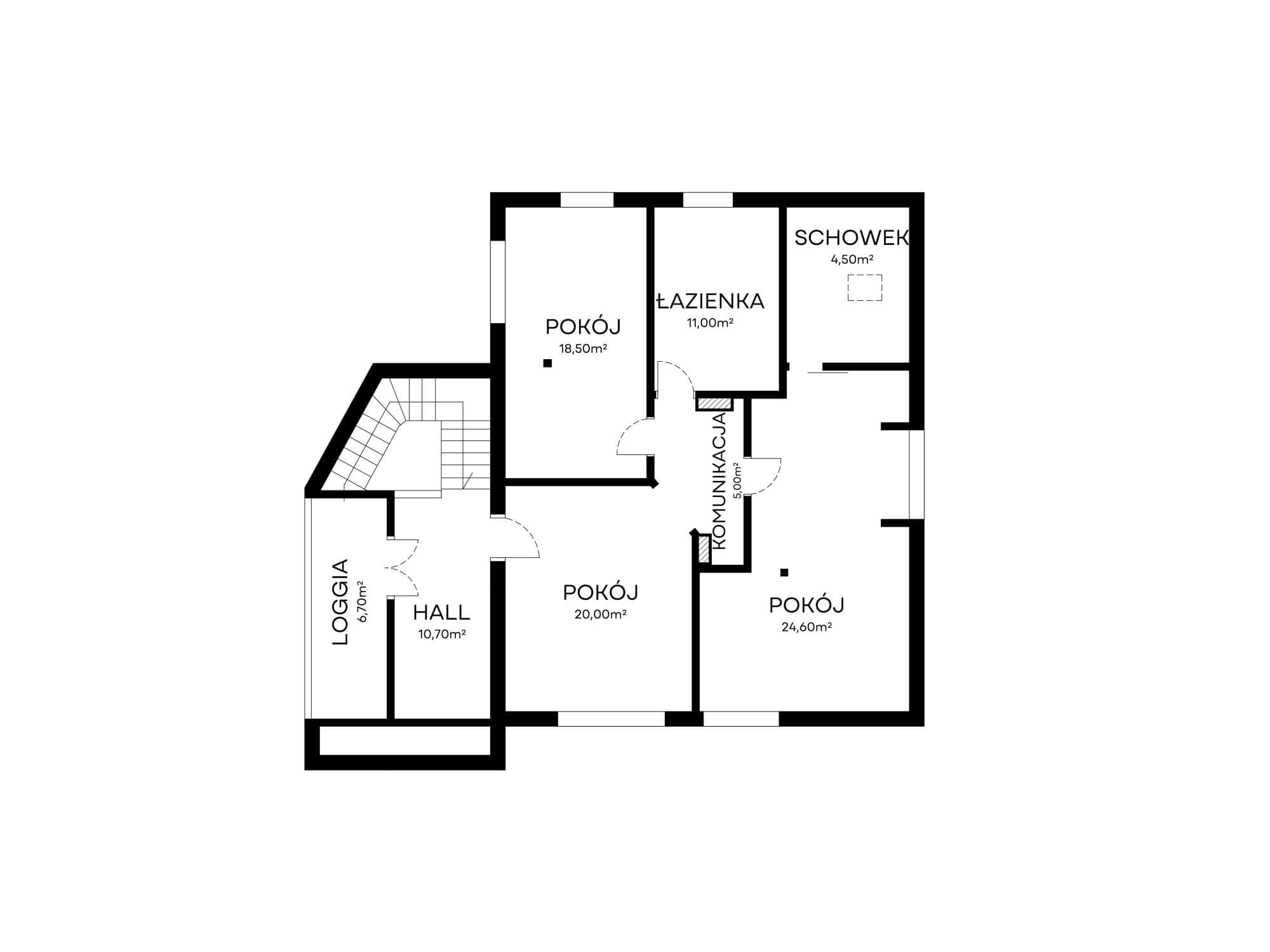 Na piętrze można zaaranżować 4 niezależne pokoje lub 3 sypialnie oraz salon z aneksem kuchennym i łazienką – w zależności od potrzeb przyszłych właścicieli.