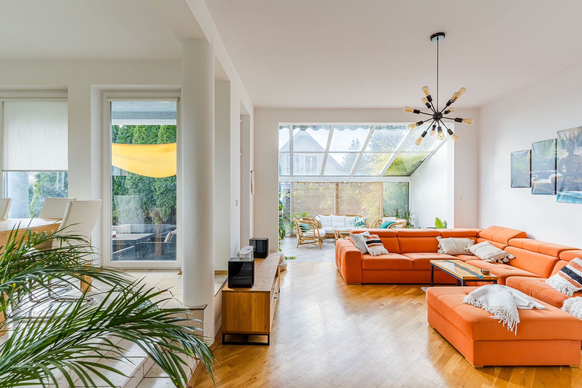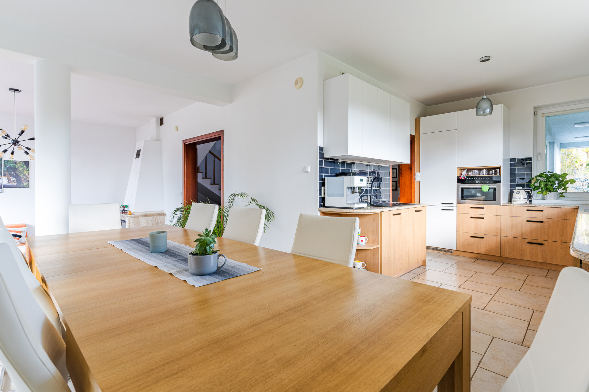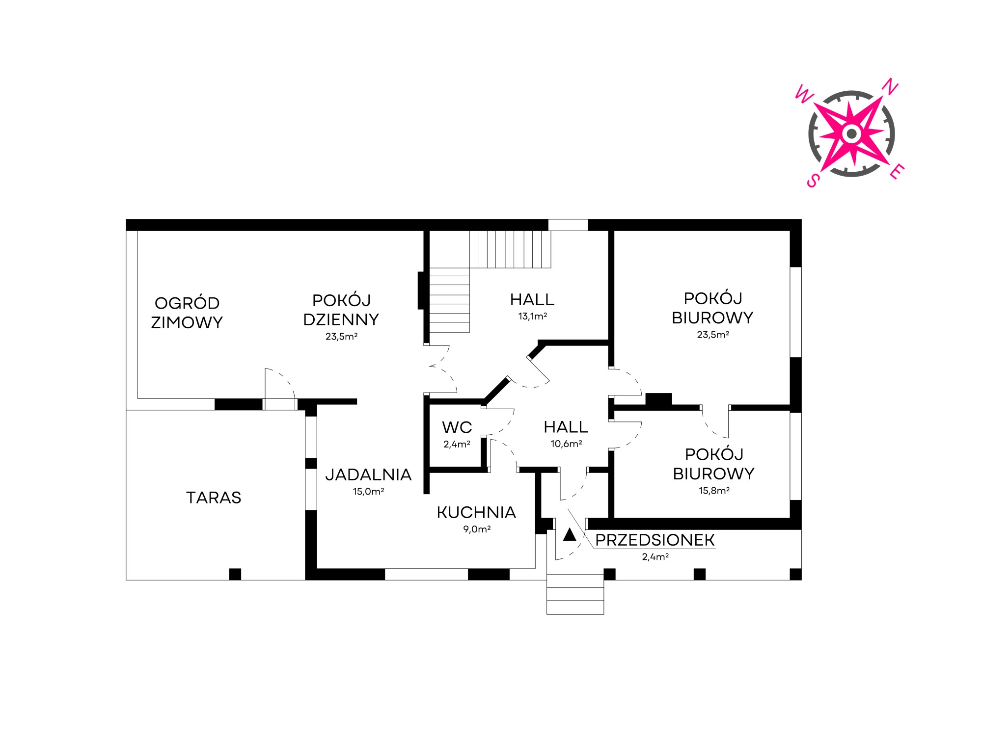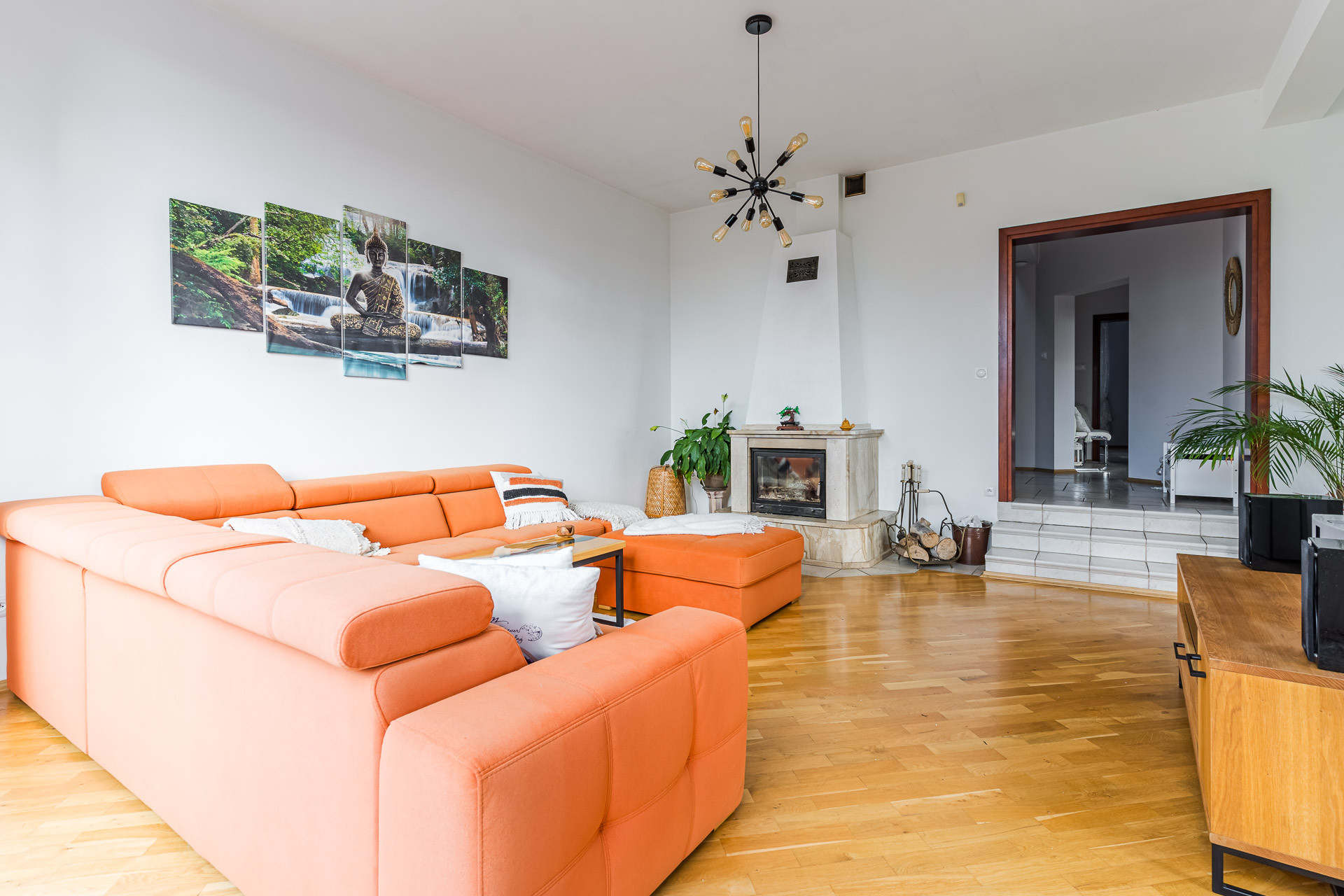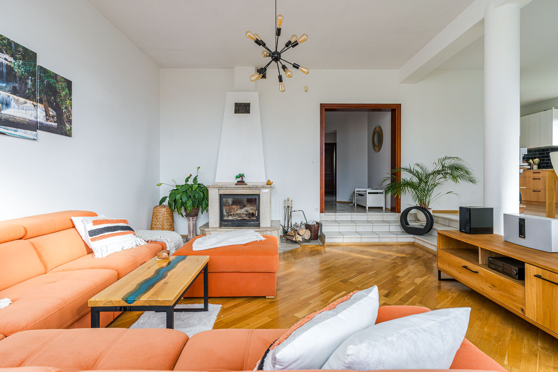 – przestronny salon z kominkiem i jadalnią oraz wyjściem na taras i zimowy ogród