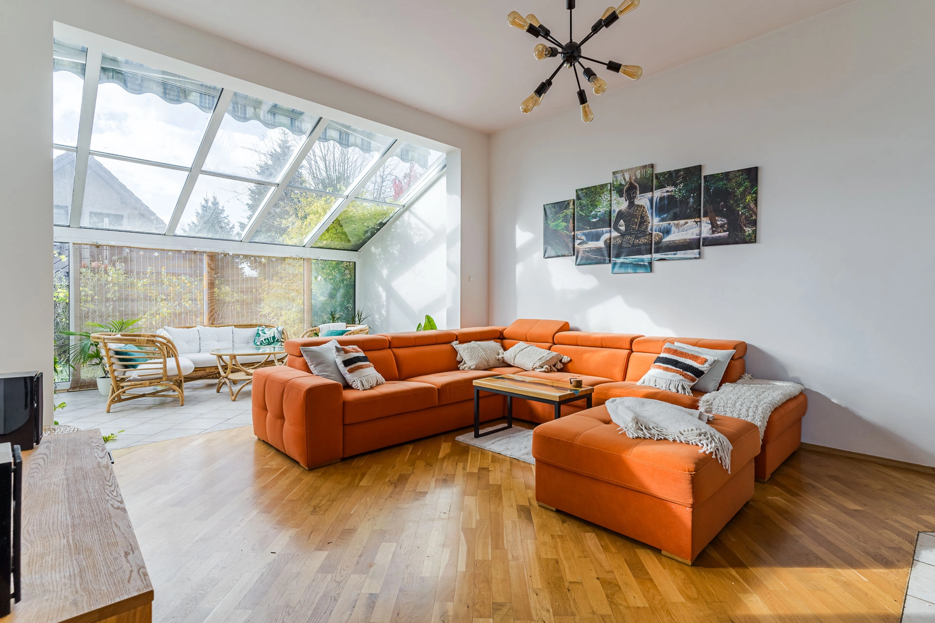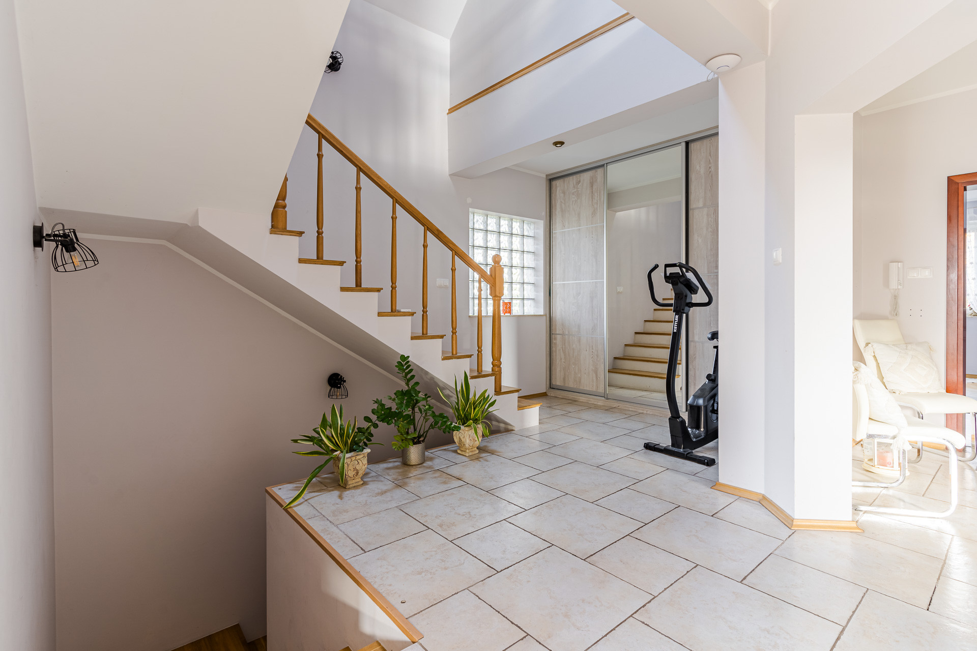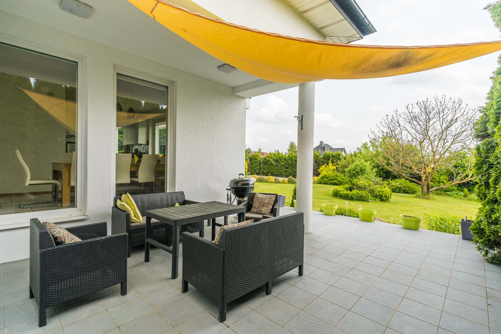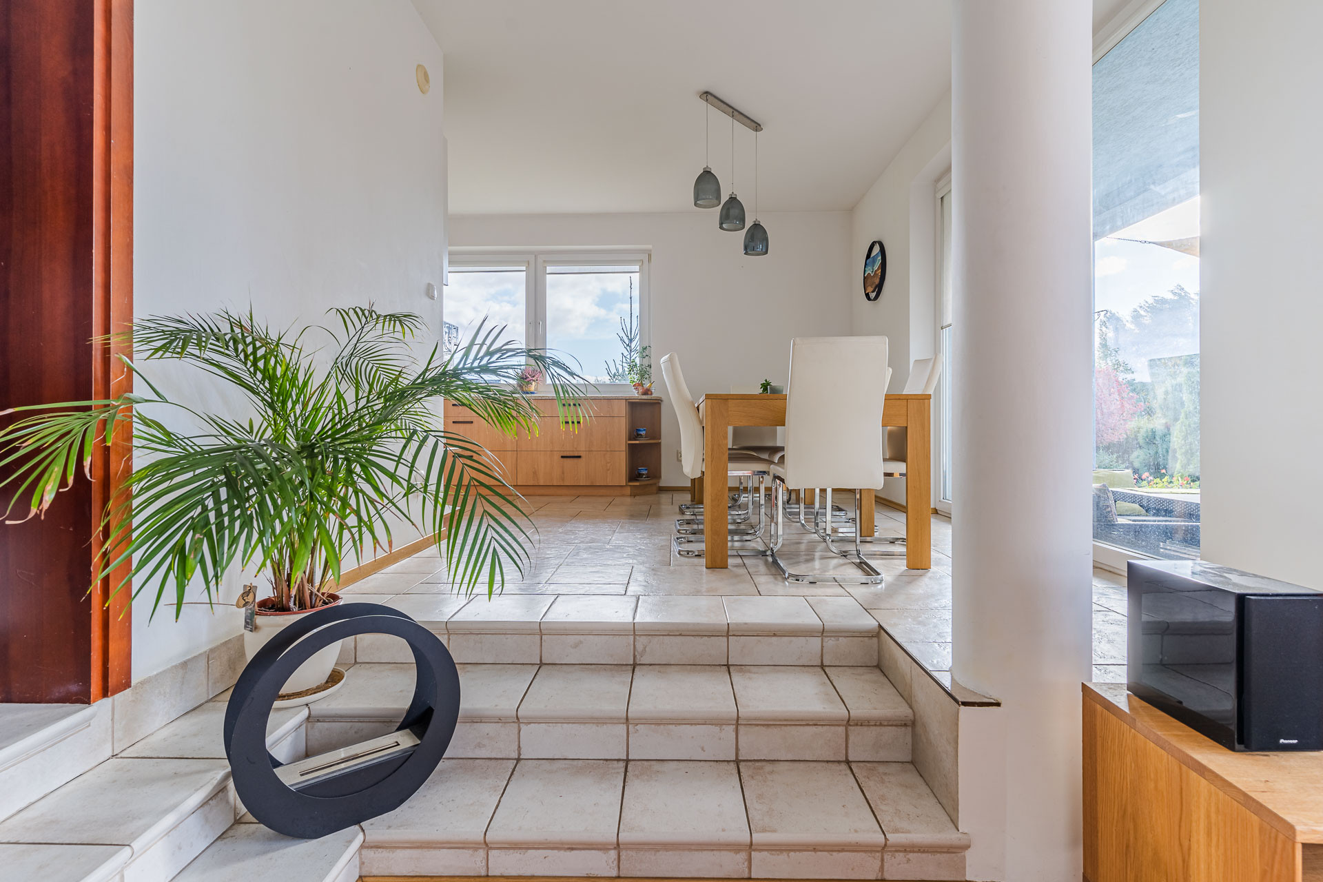 – przestronny salon z kominkiem i jadalnią oraz wyjściem na taras i zimowy ogród