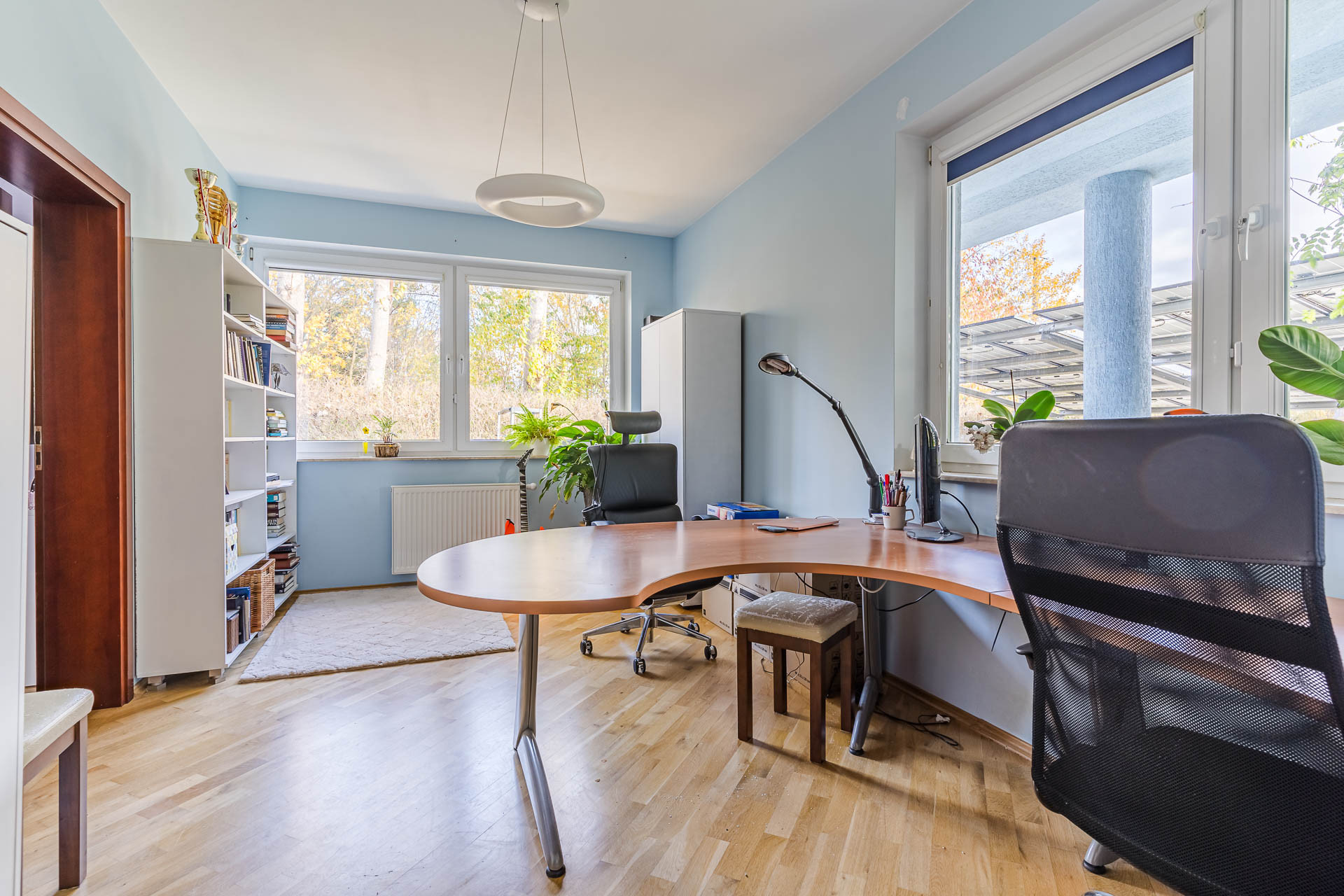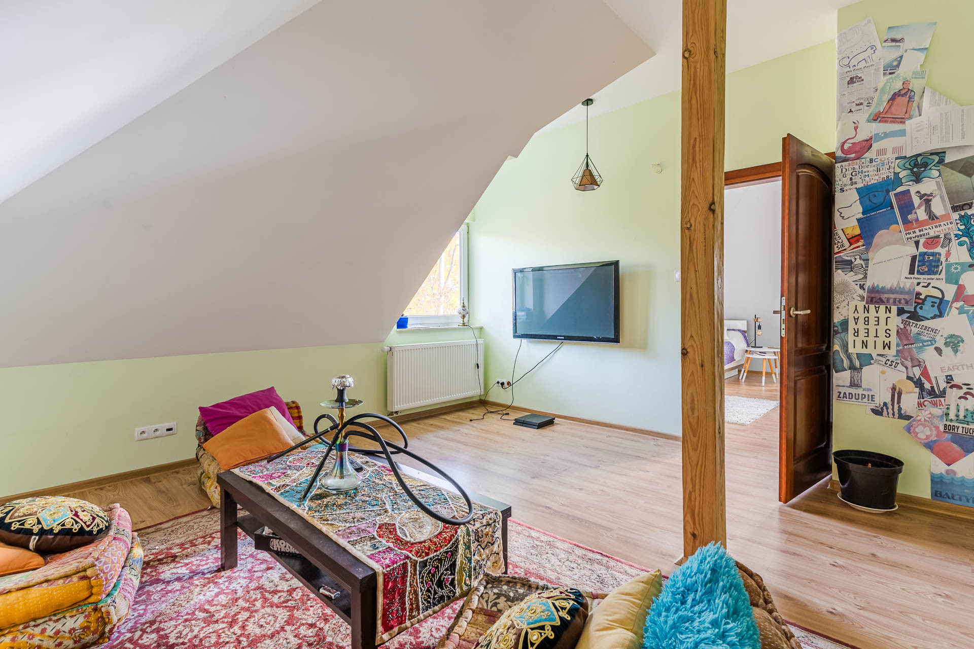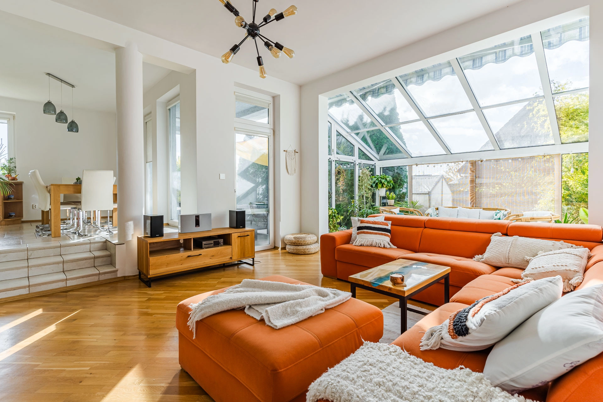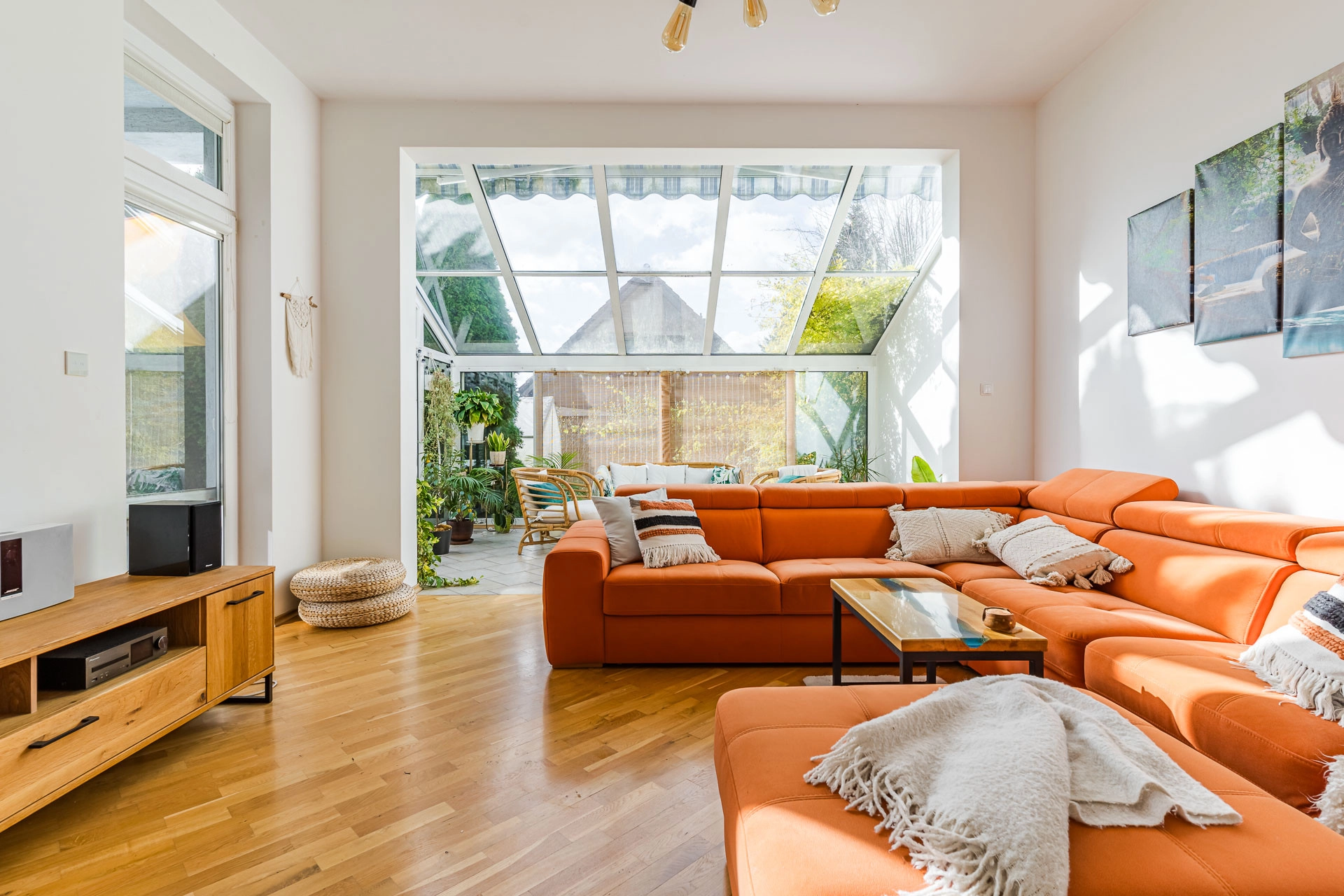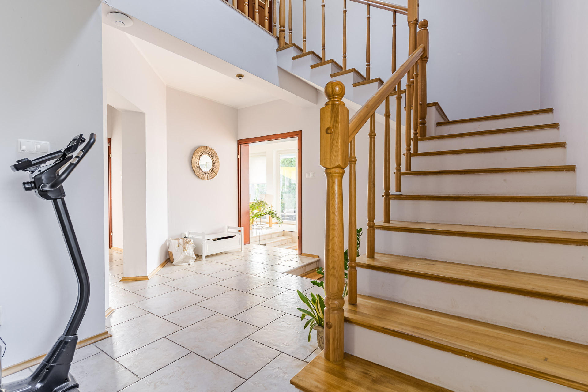 – przestronny salon z kominkiem i jadalnią oraz wyjściem na taras i zimowy ogród