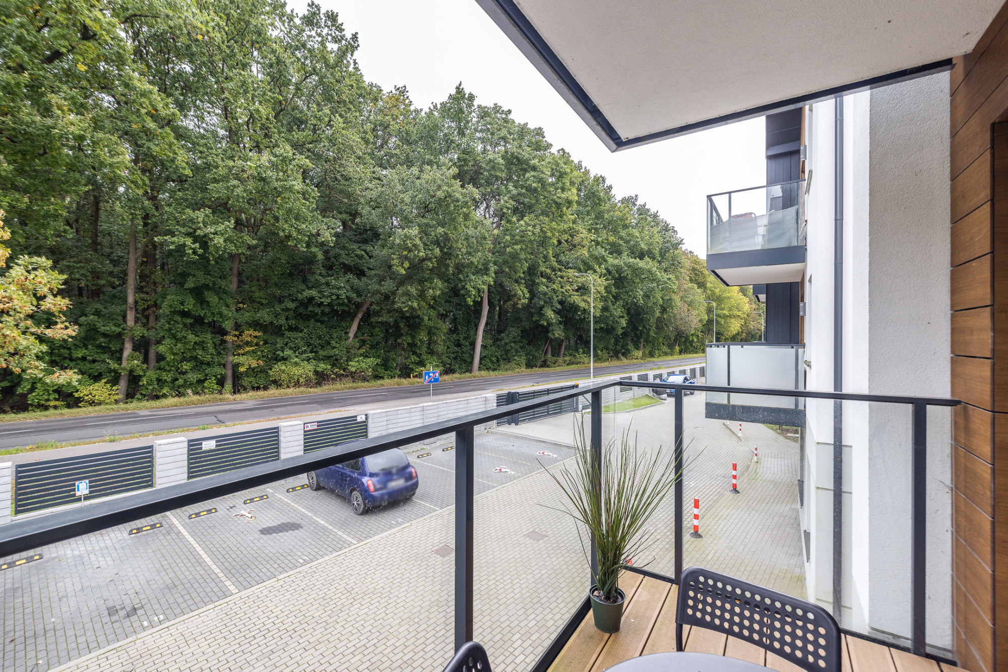 Z balkonu można podziwiać zieleń i wsłuchiwać się w śpiew ptaków.