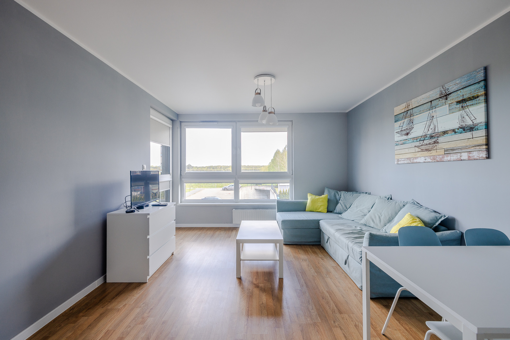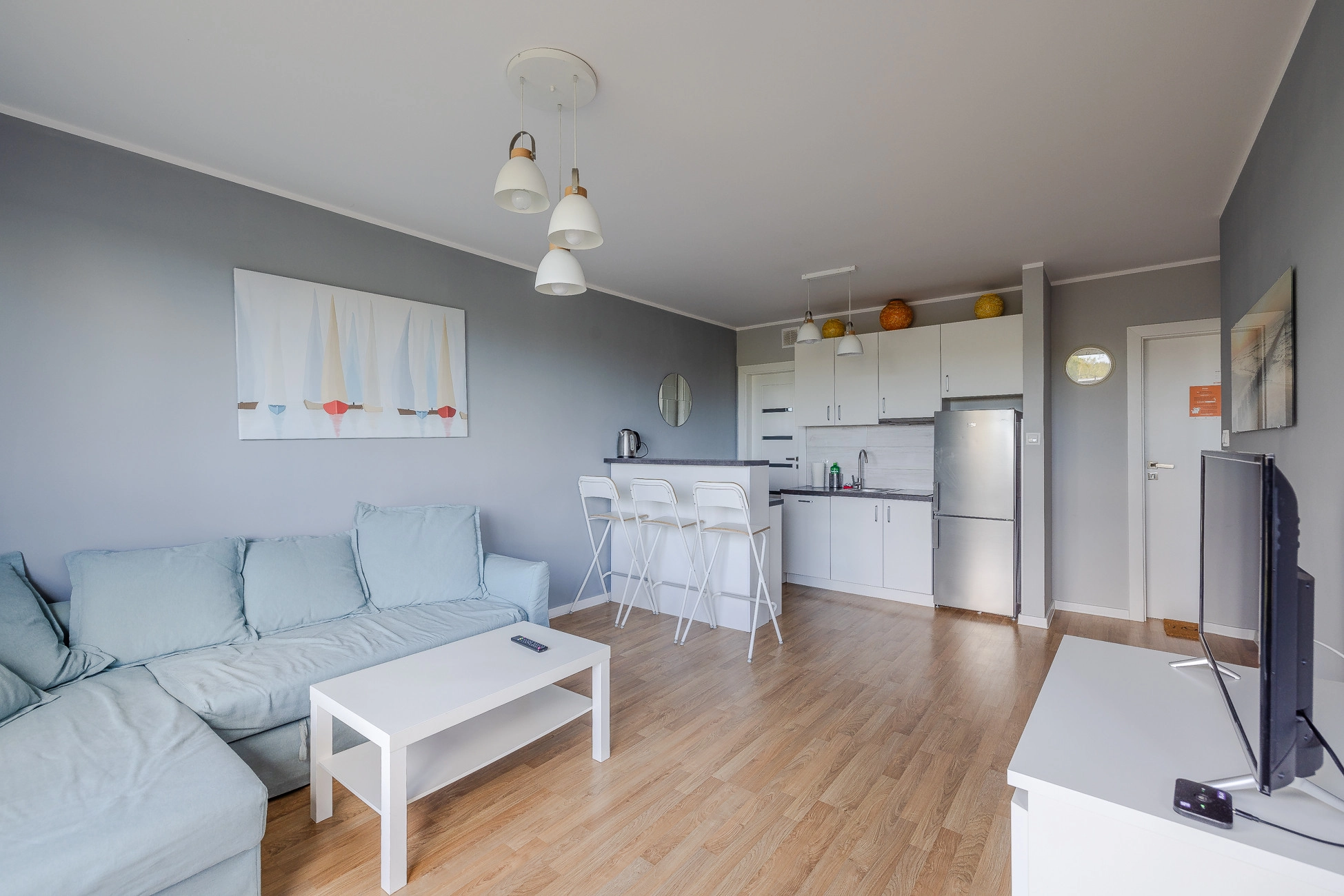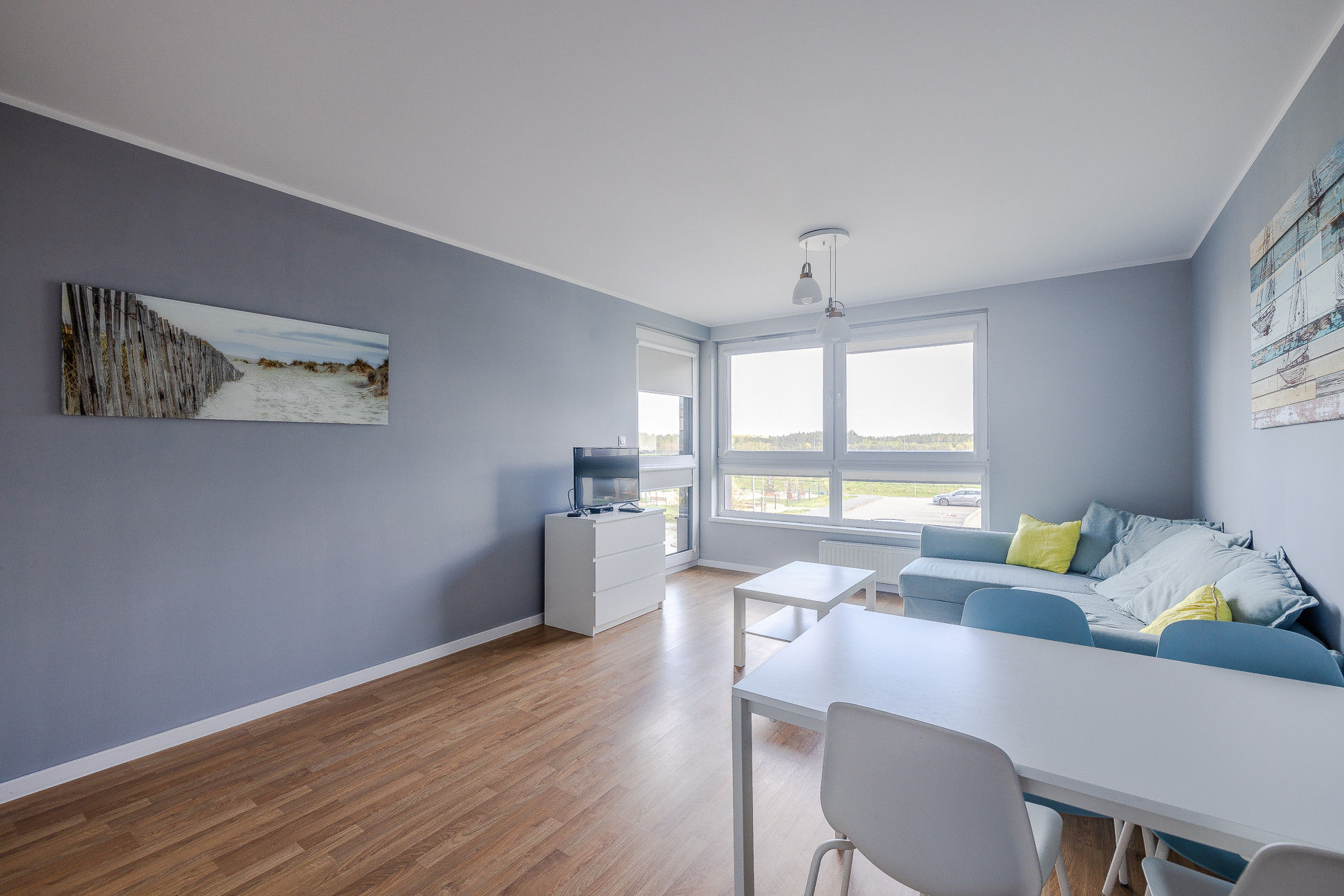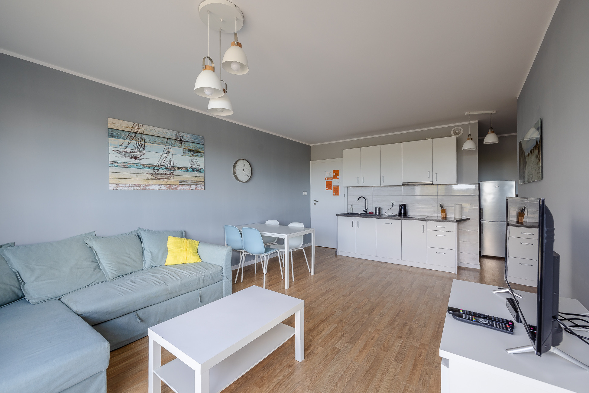 – Salon z aneksem kuchennym i wyjściem na loggię,