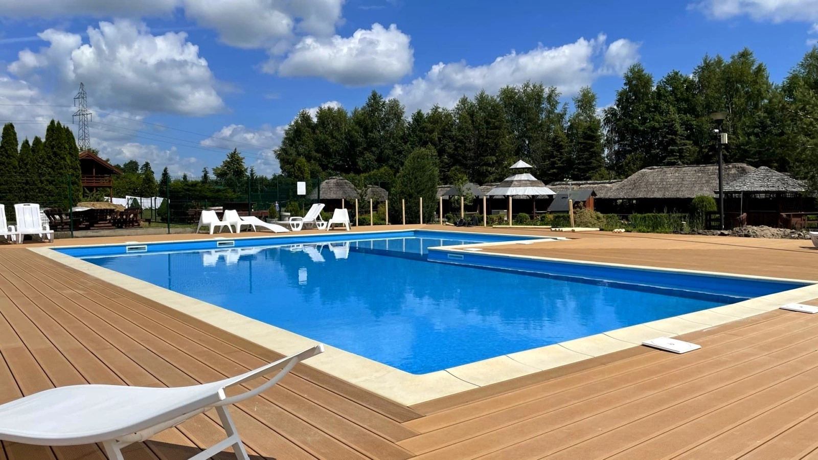 Basen o powierzchni 115 m2, łóżka oraz fotele
