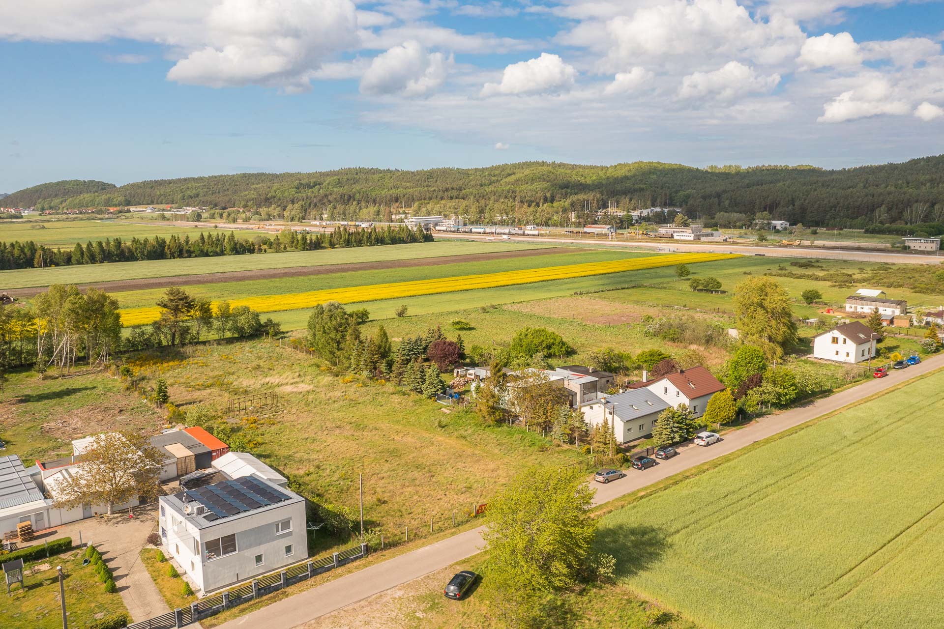 Działka położona jest w odległości 14km od centrum Gdyni. W odległości 1km sklepy, punkty usługowe. Dojazd do plaży zajmuje ok. 15min.
