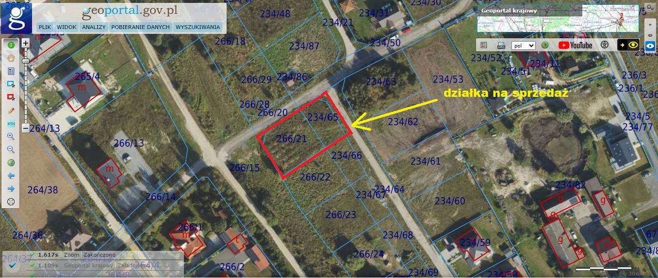 DZIAŁKA: Na sprzedaż działka budowlana składająca się z 2 działek nr 266/21, oraz 234/65 o łącznej powierzchni 1033 m² (ok 43 m x 25 m). W najbliższym sąsiedztwie znajdują się domy jednorodzinne. Działka jest płaska w kształcie prostokątnym.