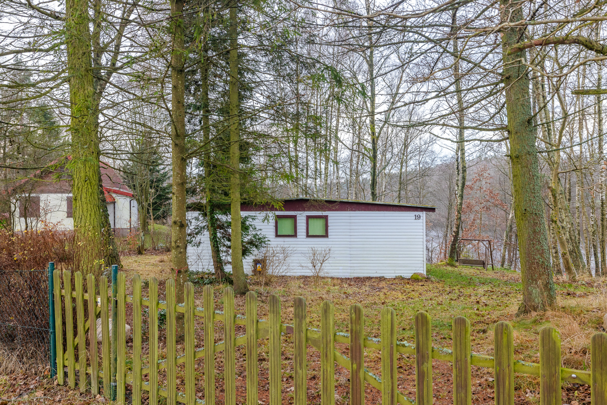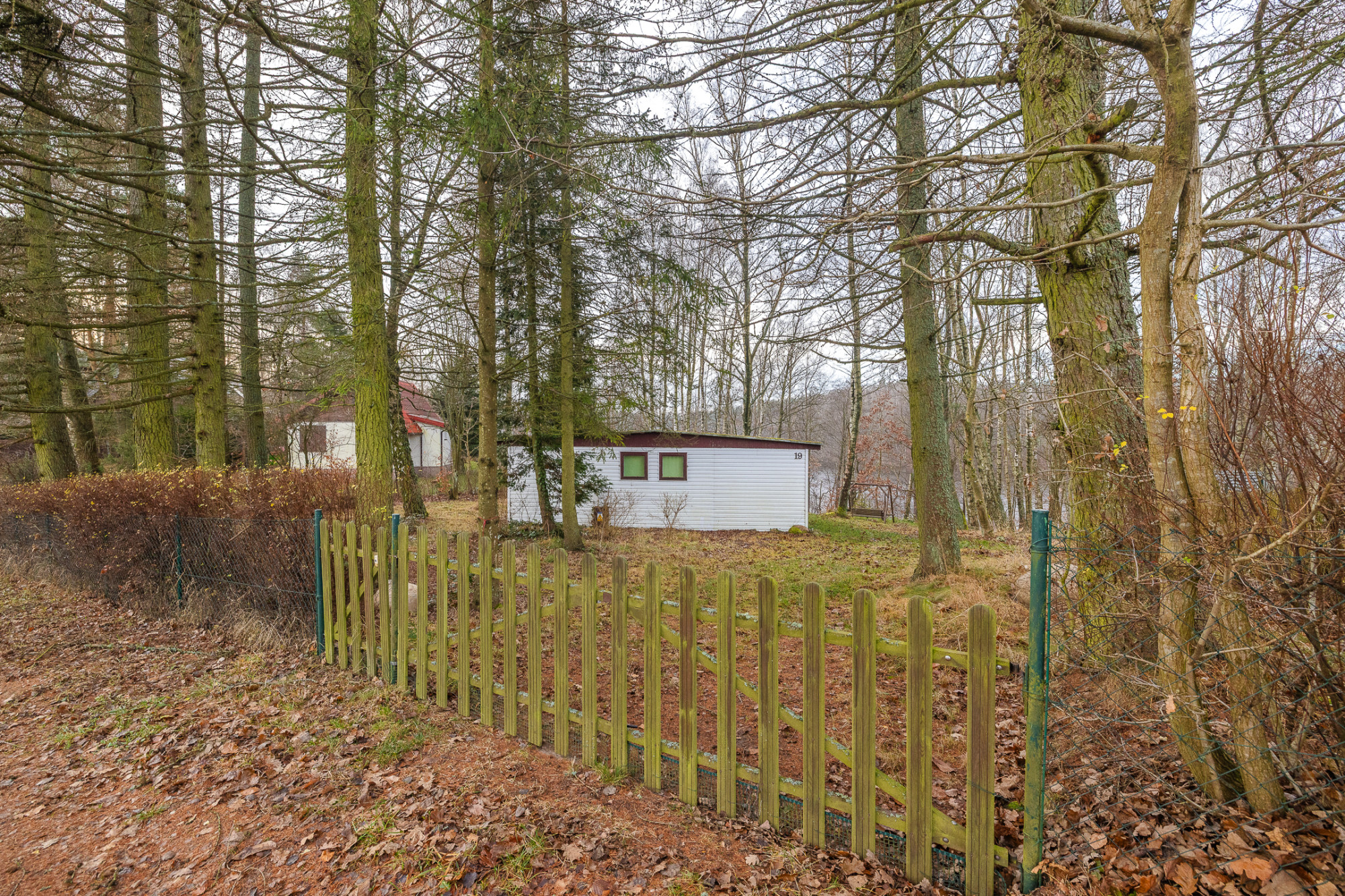 Działka jest zabudowana parterowym domkiem letniskowym. Teren jest lekko nachylony, dzięki czemu rozpościera się piękny widok na jezioro. Działka jest ogrodzona. Działka z dużą ilością drzew iglastych, tworzących niezwykły klimat tego miejsca.