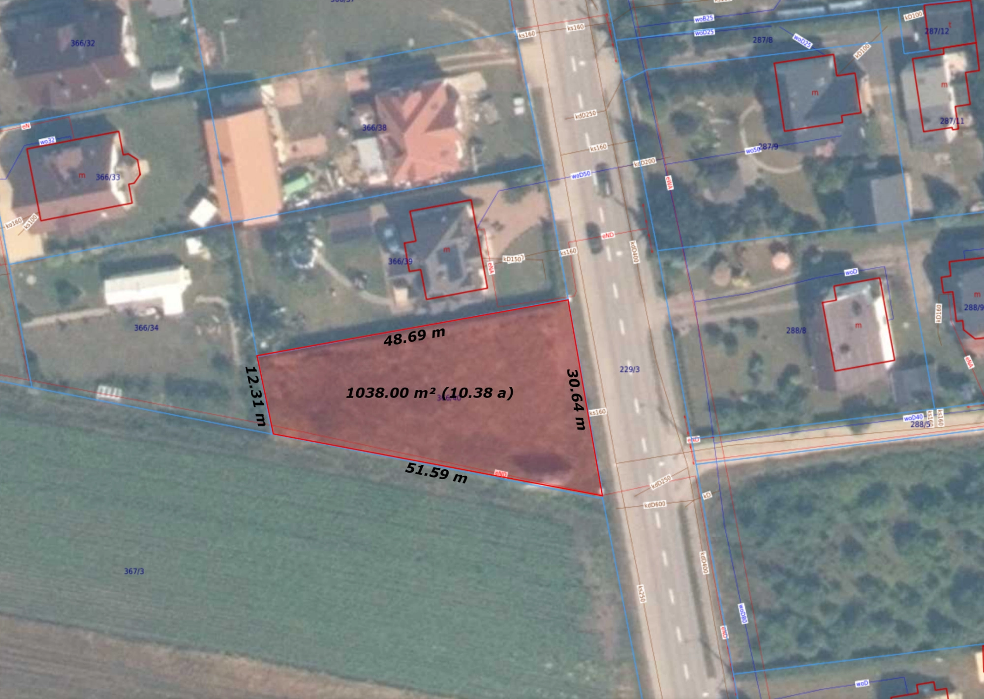 W drodze przy granicy działki media takie jak WODA, PRĄD, KANALIZACJA.