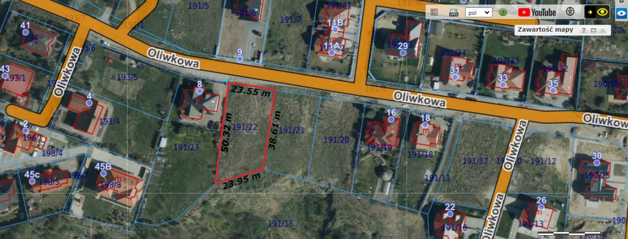 Działka o numerze 191/22, znajduje się w dzielnicy Gdańsk Jasień w otoczeniu domów jedno i dwu rodzinnych przy ul. Oliwkowej. Bardzo blisko do zjazdu na obwodnice oraz około 20 min autem do centrum Gdańska. Na końcu działki przepiękny widok na panoramę Gdańska z terenami zielonymi. Przystanek autobusowy w odległości 200m, blisko pętla tramwajowa.