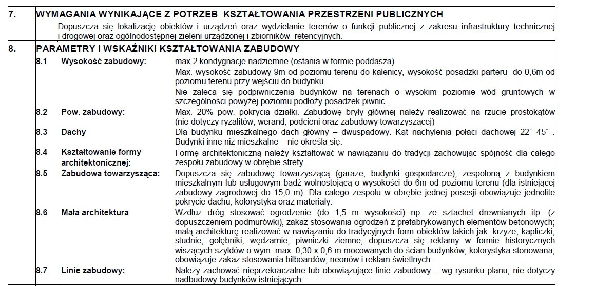 – Wysokość zabudowy: max 2 kondygnacje nadziemne (ostania w formie poddasza)