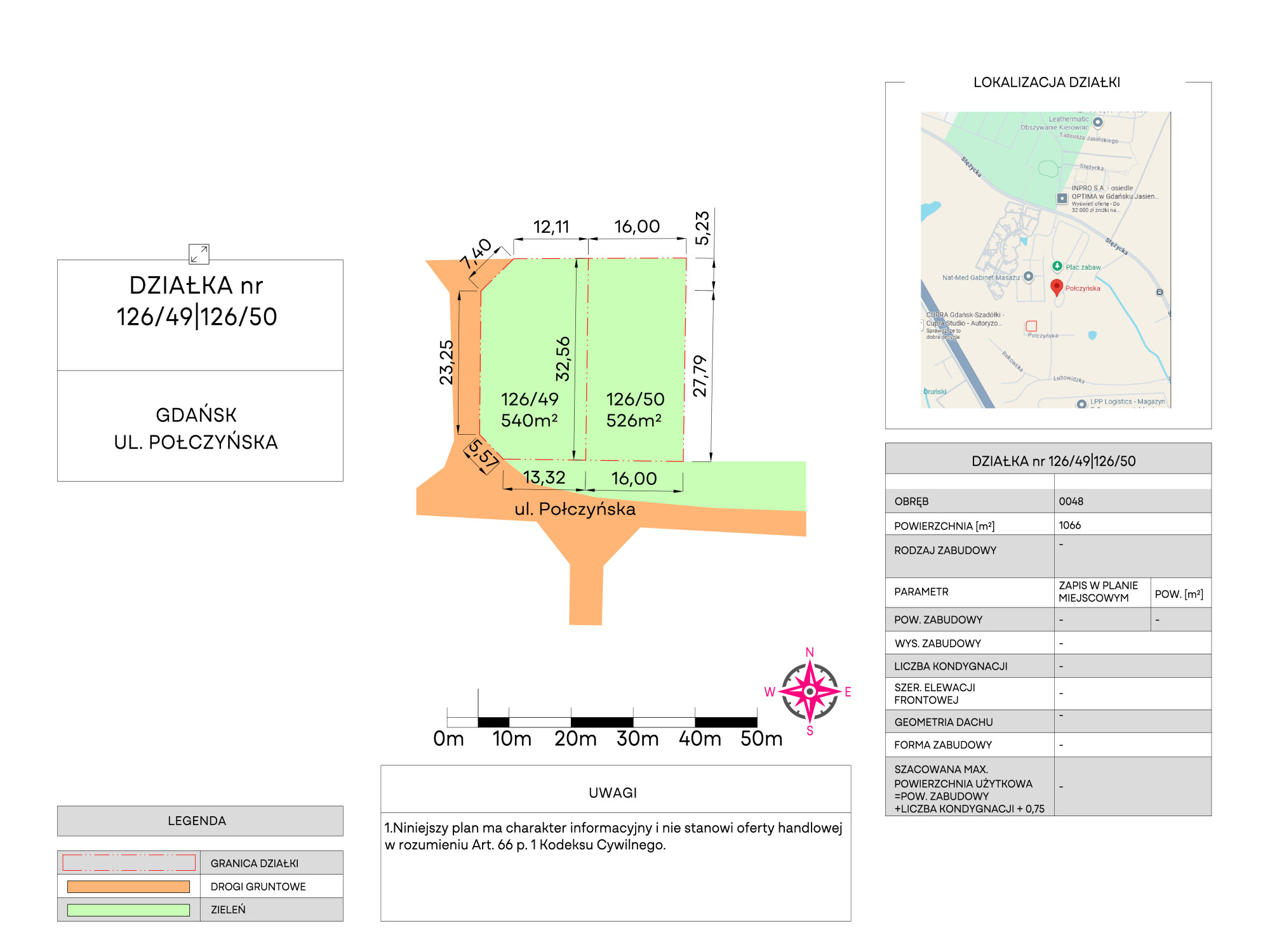 Na sprzedaż 2 działki o powierzchni łącznej 1067 m2 przeznaczone pod  zabudowę mieszkaniowo-usługową przy ul. Połczyńskiej w Gdańsku.