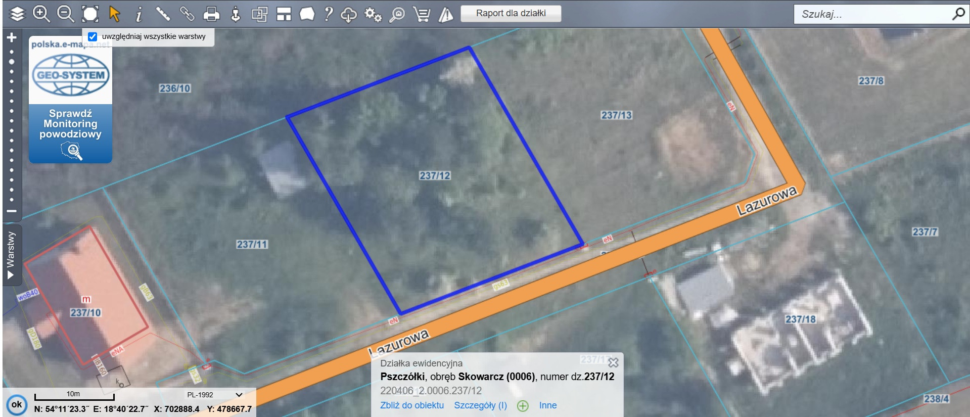Działka o numerze ewidencyjnym 237/12, położona w obrębie Skowarcz (obręb 0006), gmina Pszczółki, powiat gdański, objęta jest miejscowym planem zagospodarowania przestrzennego MPZP uchwalonym uchwałą nr II/25/2006 z dnia 26 kwietnia 2007 roku. Działka o powierzchni 728 m² posiada dostęp do mediów: prąd, gaz w drodze obok działki, woda i kanalizacja w trakcie realizacji przez gminę. Teren, na którym zlokalizowana jest działka położony jest na zachód od drogi krajowej E9. Są to tereny położone wyżej, niż te po wschodniej stronie E91, dzięki czemu nie ma ryzyka wystąpienia terenu podmokłego. Szerokość (front działki) 25 m, długość 29 m. Działka bardzo pięknie usytuowana na wzgórzu z umiarkowanym pochyleniem w kierunku wschodnim i wjazdem od południa. Idealna pod projekt domu z wejściem od południa i garażem w podpiwniczeniu. Na działce rosną ładne duże brzozy które można wkomponować w ogród przed domem.