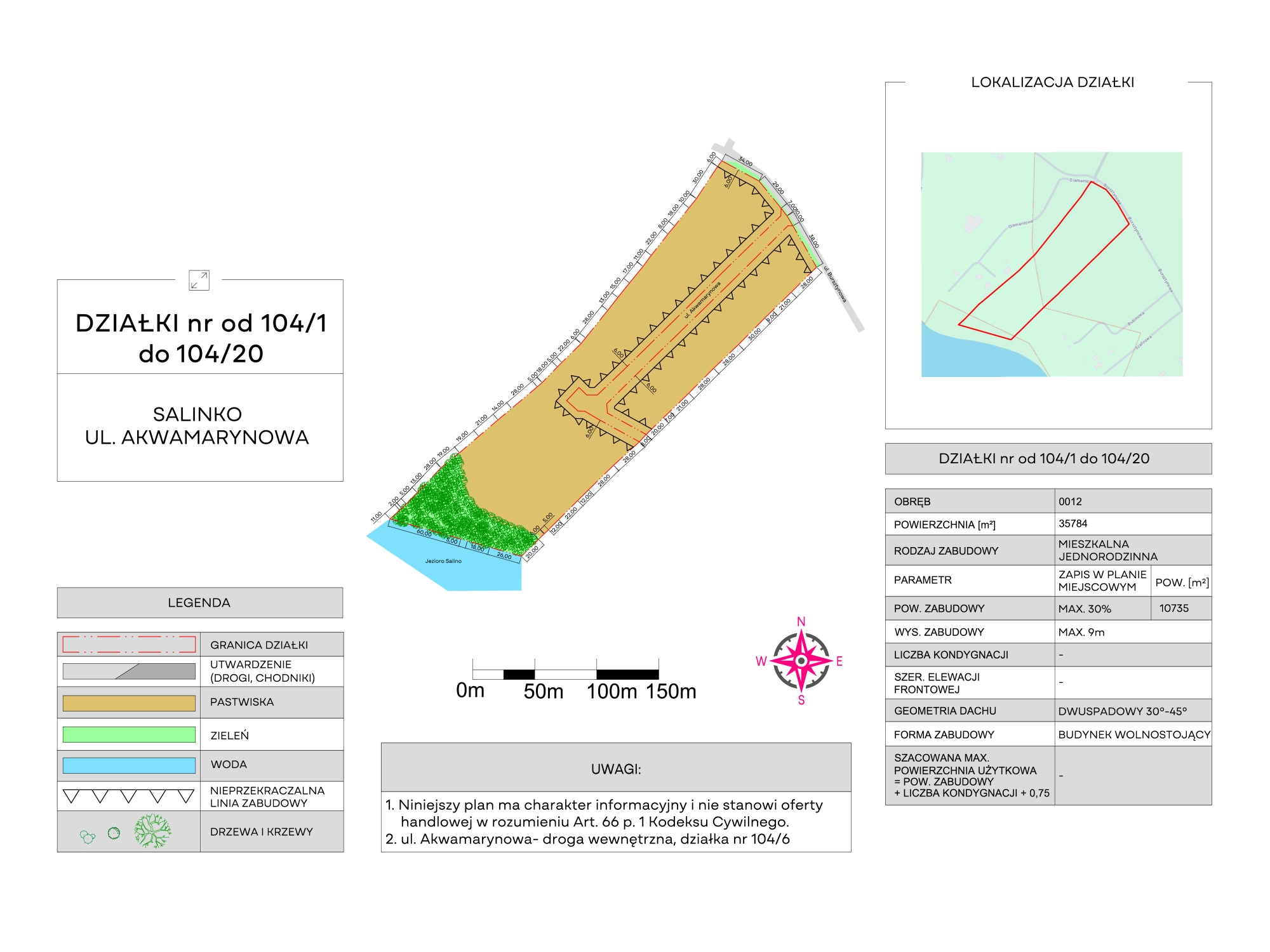 Działka budowlana o powierzchni 35.784 m2 położona w miejscowości Salinko przy ul. Akwamarynowej. Działka jest już podzielona na mniejsze; istnieje możliwość zakupu działki w całości lub działki wybranej przez siebie.