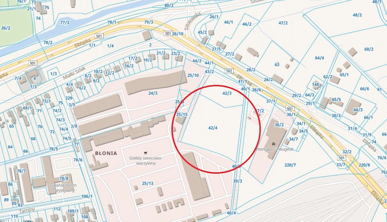 Na sprzedaż działka o powierzchni 9847 m2, usytuowana w Gdańsku przy ul. Elbląskiej (nie ma bezpośredniego dostępu do ulicy Elbląskiej).