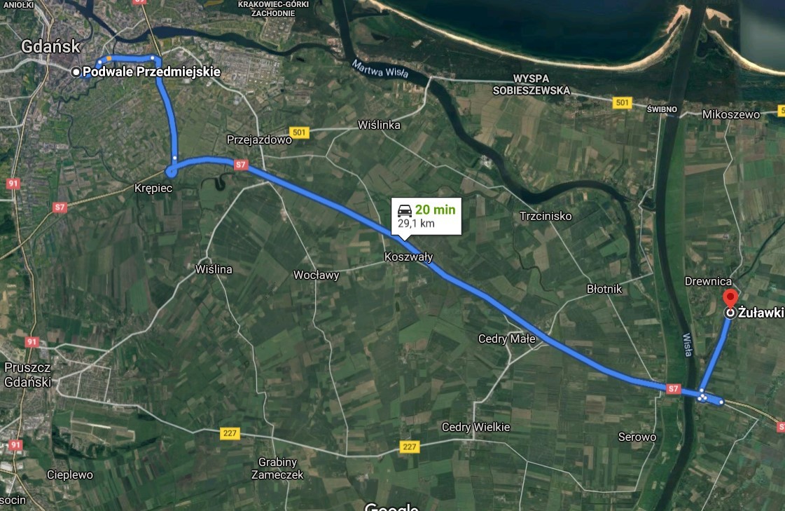 Miejscowość, jak sama nazwa wskazuje leży na Żuławach Wiślanych – bardzo ciekawym terenie położonym blisko morza, wzdłuż delty Wisły oraz całej Pętli Żuławskiej (turystyczny system rzek i kanałów do żeglugi śródlądowej). W pobliżu działki przebiega jedna z dróg wodnych – rzeka Szkarpawa. Od morza dzieli ten teren zaledwie 7 km w linii prostej. Odległość od nowej trasy S7 – 3 minuty samochodem. Dojazd do Gdańska dzięki drodze ekspresowej zaledwie 20 minut, a do Elbląga 25 minut.