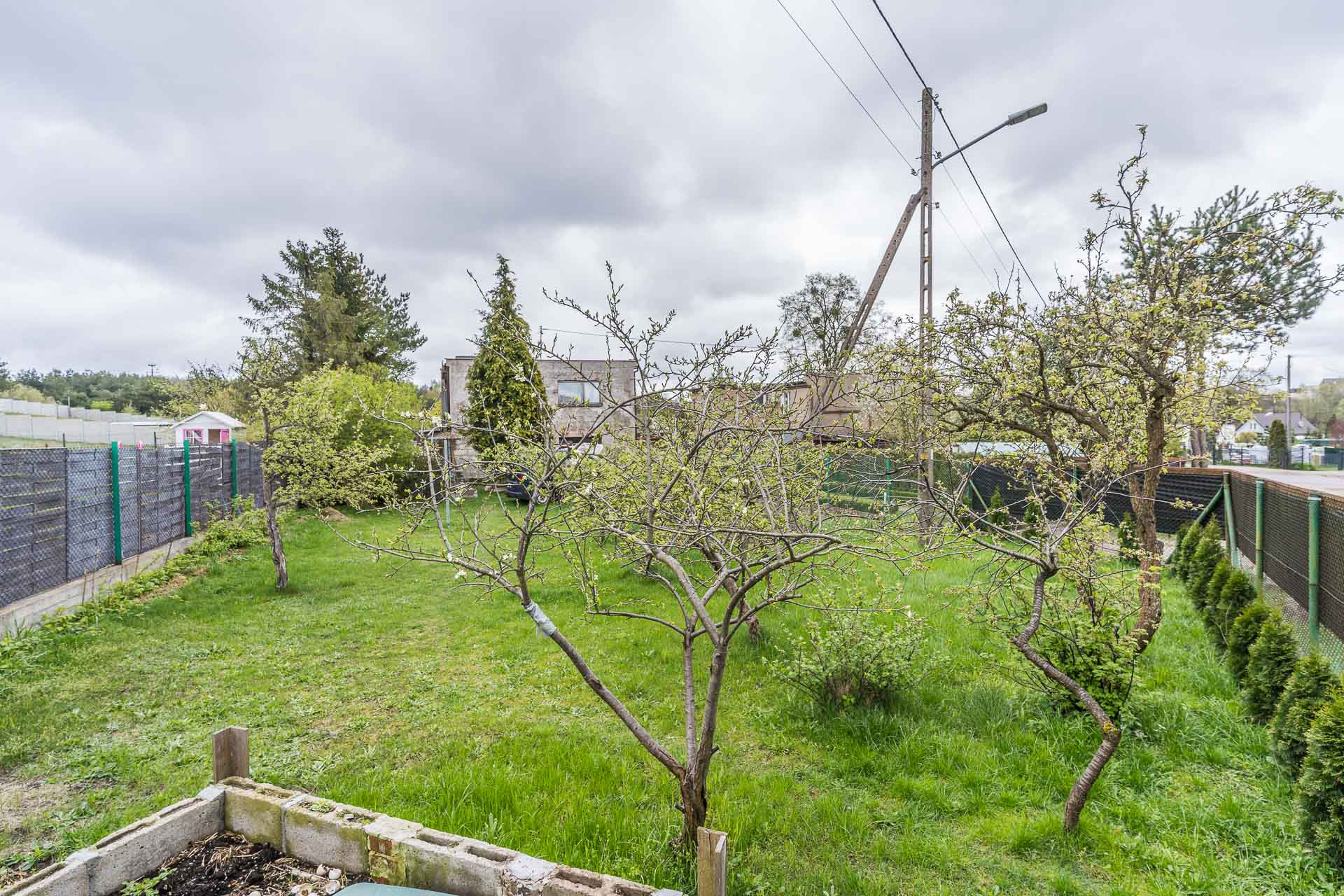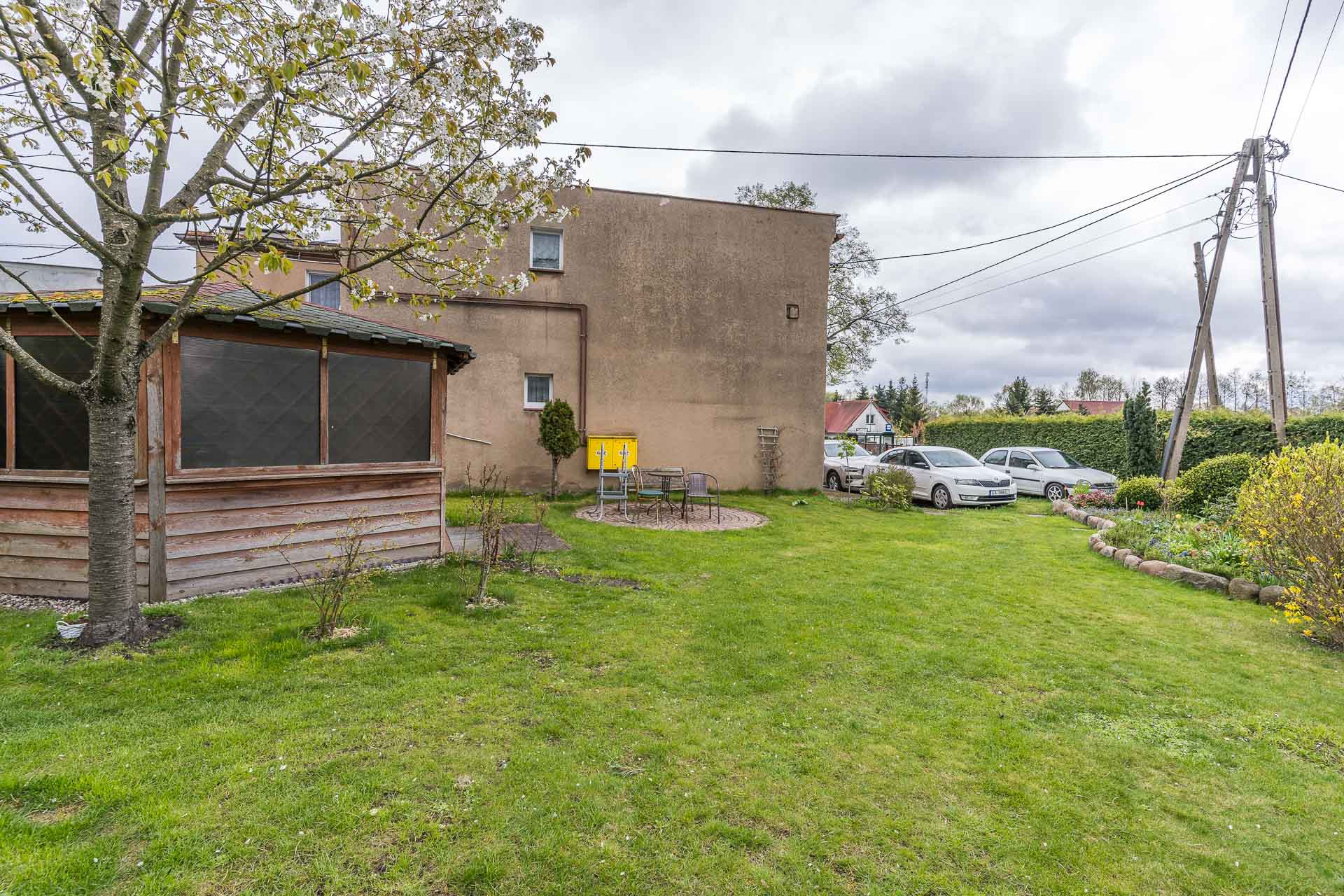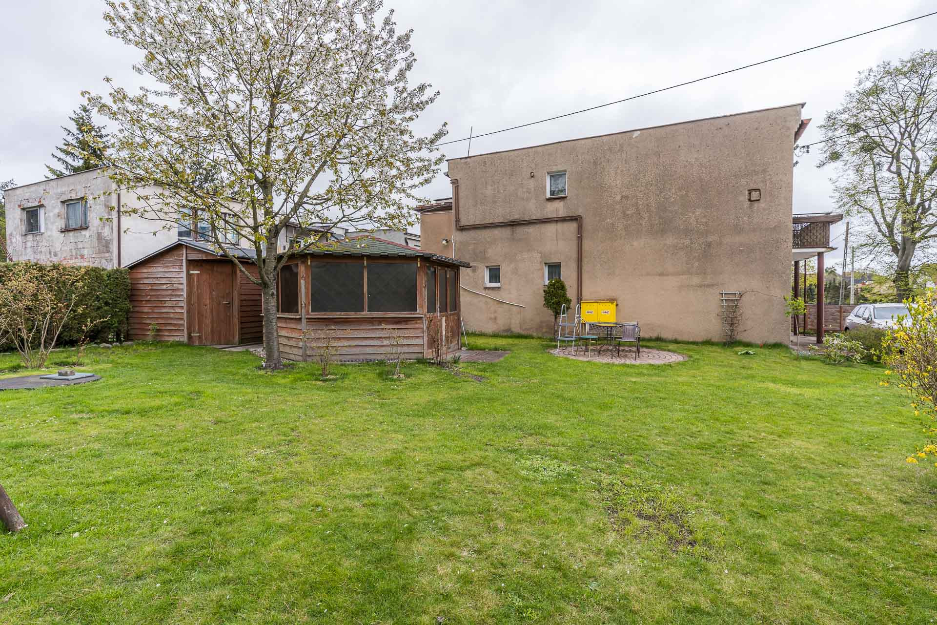2. Budynek gospdodarczo-usługowy z garażem (z kanałem) i częścią mieszkalną (mieszkanie ok 52m2 na piętrze z niezależnym wejściem) – łącznie ok 200m2 (w tym część do wykończenia), wybudowany w latach 50., rozbudowany w latach 80-90. Duży ogród podzielony na dwie części, altana ogrodowa, całość posesji ogrodzona.