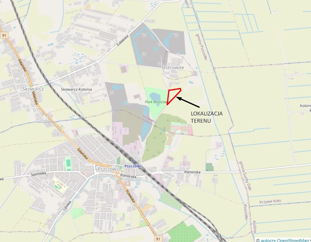 Uwagę zwraca na pewno bardzo ładne usytuowanie działki, znajduje się ona w pewnej odległości od terenów zurbanizowanych miast Pszczółki i Skowarcz dlatego jest tu sielsko i bardzo przyjemnie. Najbliższe otoczenie to wspomniane osiedle domów jednorodzinnych, pola, las jak również powstały niedawno Park Brzozowy. Warto zatrzymać się przy nim dłużej bo to ciekawa inwestycja.