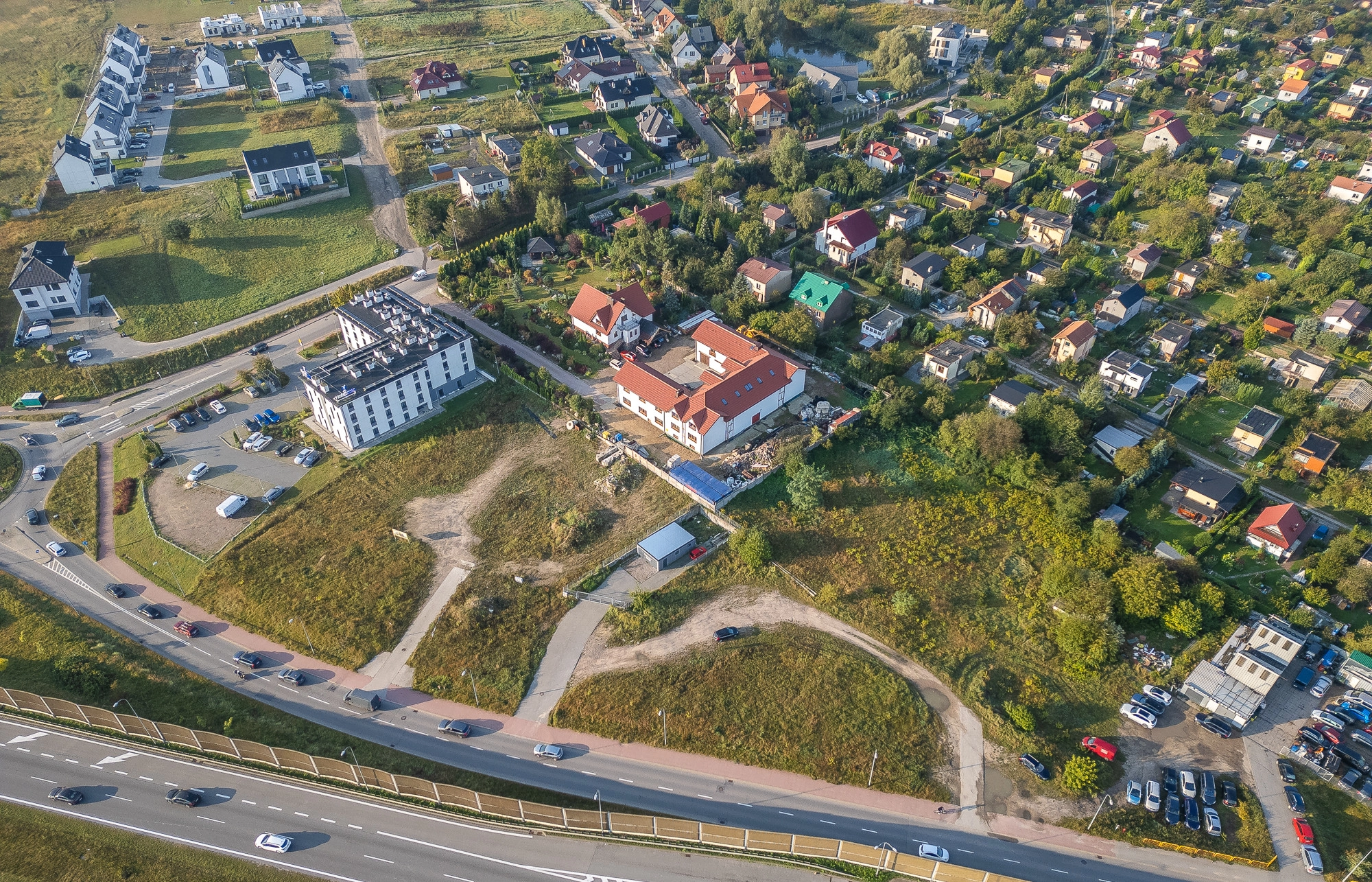 Działka budowlana składająca się z 2 działek o łącznej powierzchni 892 m2 bezpośrednio przy ulicy Kartuskiej – przed działką znajduje się jedynie szeroki pas drogowy.