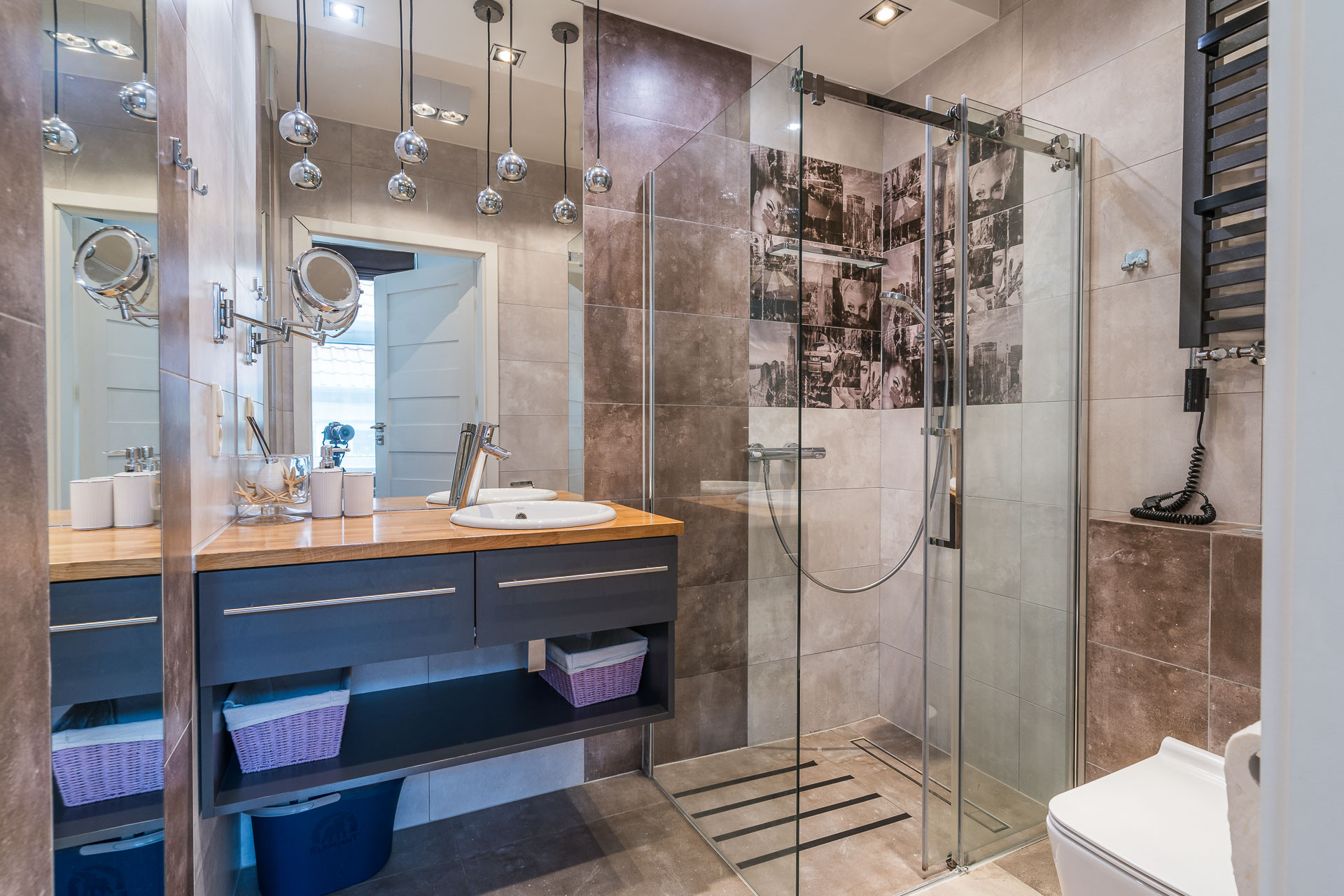 – łazienka: z prysznicem, umywalką, lustrem oraz WC.