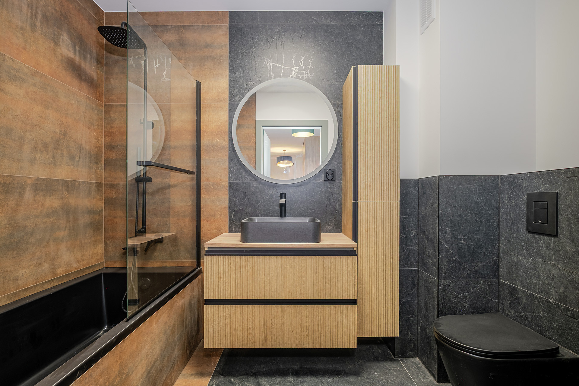 Nowoczesne oświetlenie, eleganckie wykończenie ścian i podłóg