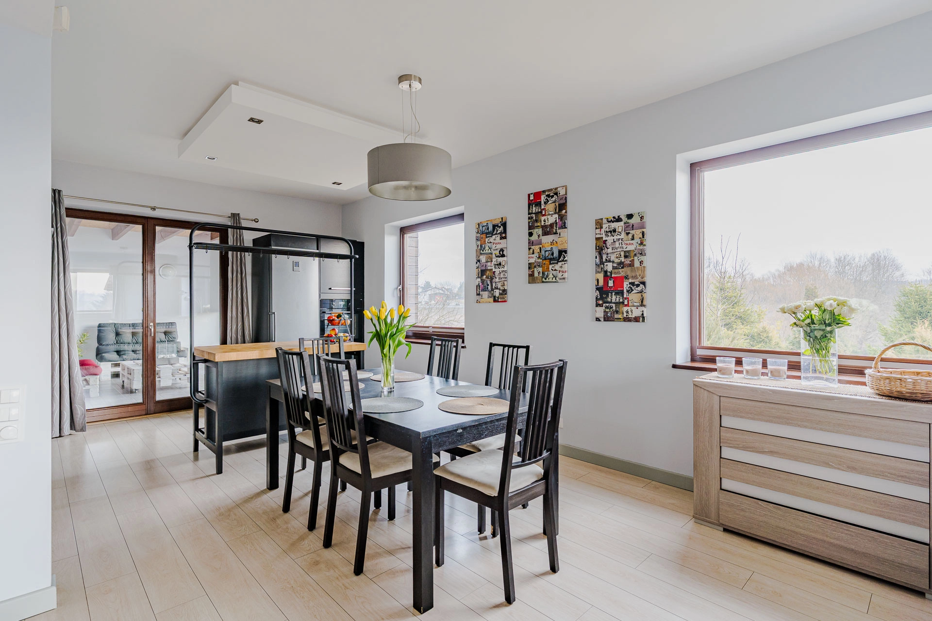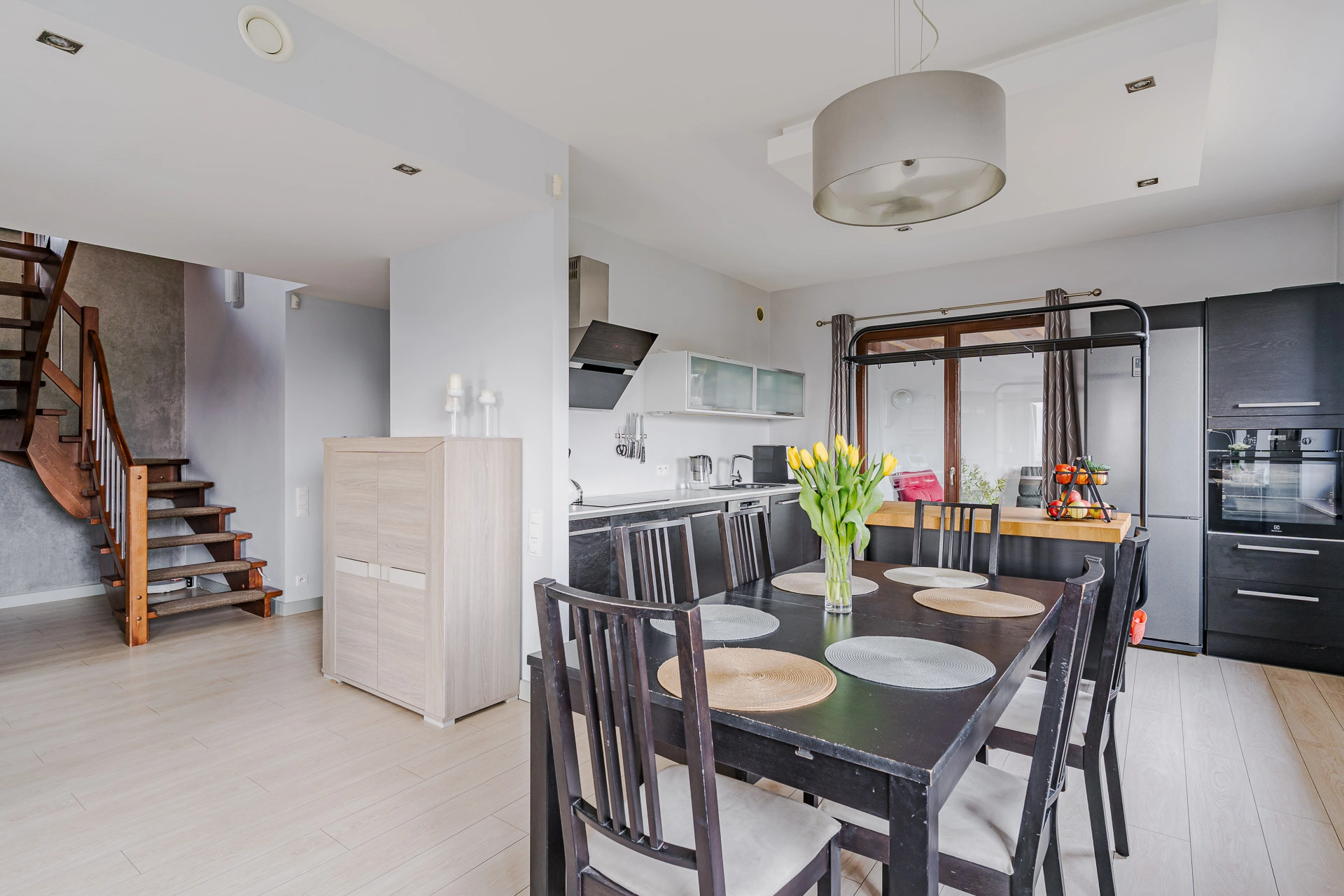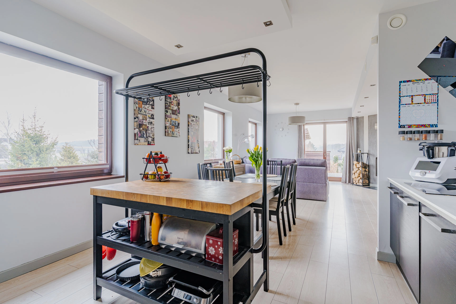 – Pokój dzienny z jadalnia oraz kuchnią oddzieloną wyspą o powierzchni 42,78 m/2. Z wyjściem na taras i ogród, zaś z części kuchennej wyjściem do ogrodu zimowego o pow. 27,77m2.