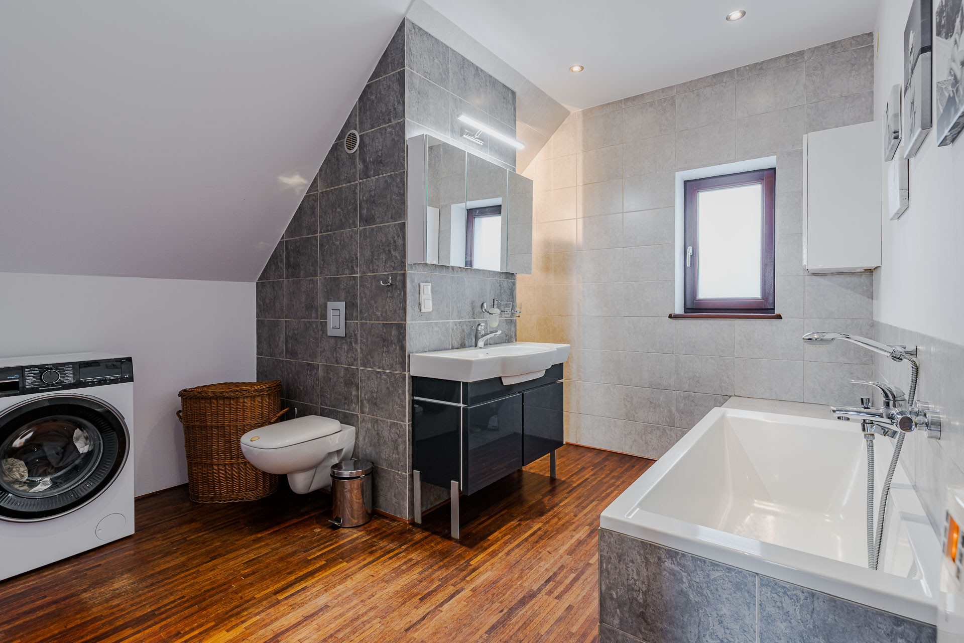 Łazienka z oknem (ok.10 m2) , wyposażona w wannę i kabinę prysznicową.