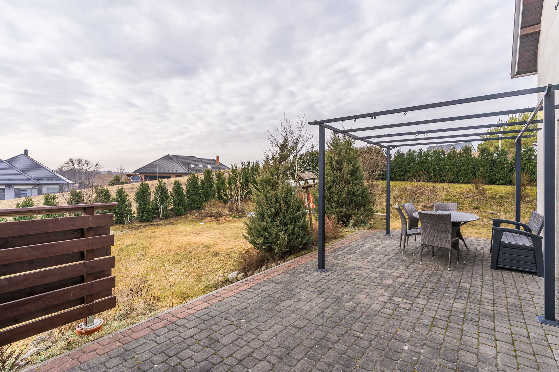 Taras od strony południowej, wyłożony kostką, częściowo zadaszony.