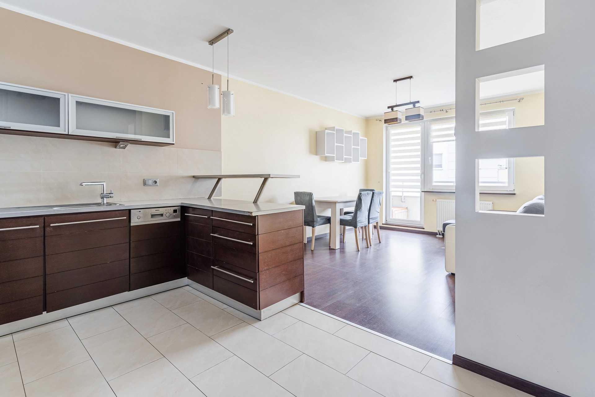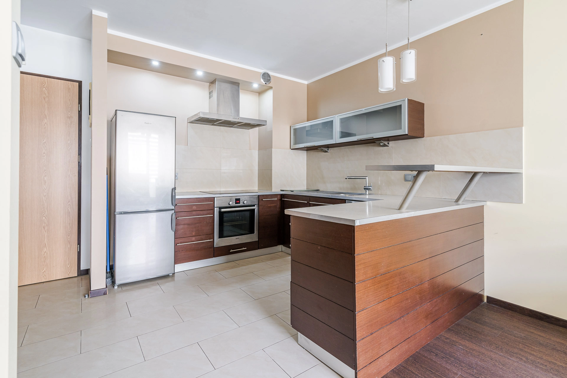 – aneks kuchenny, wyposażoy w sprzęt AGD – lodówka, płyta elektryczne, piekarnik, okap, zmywarka,