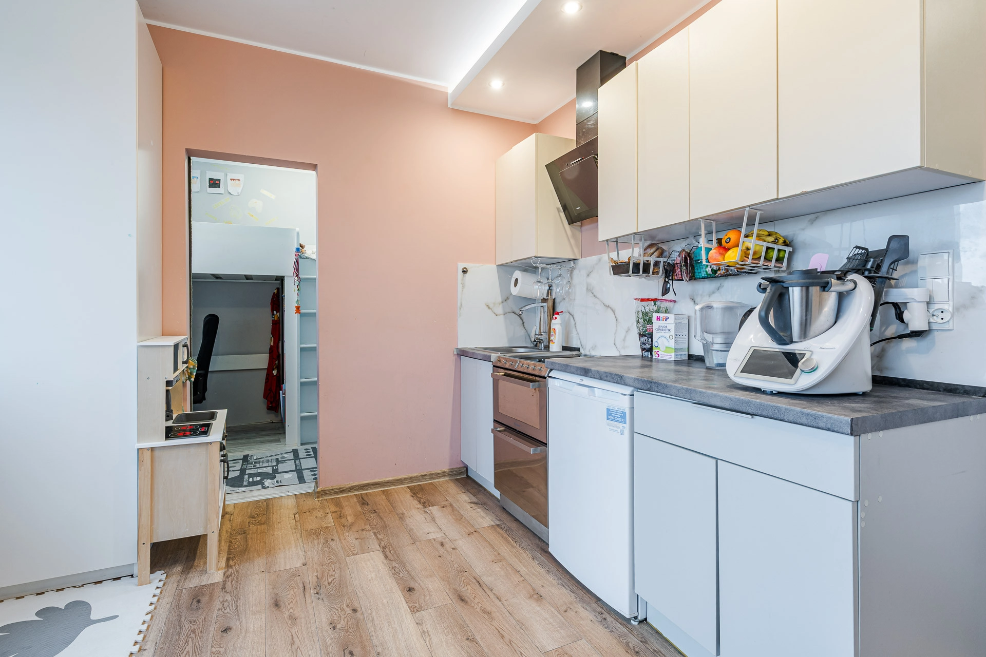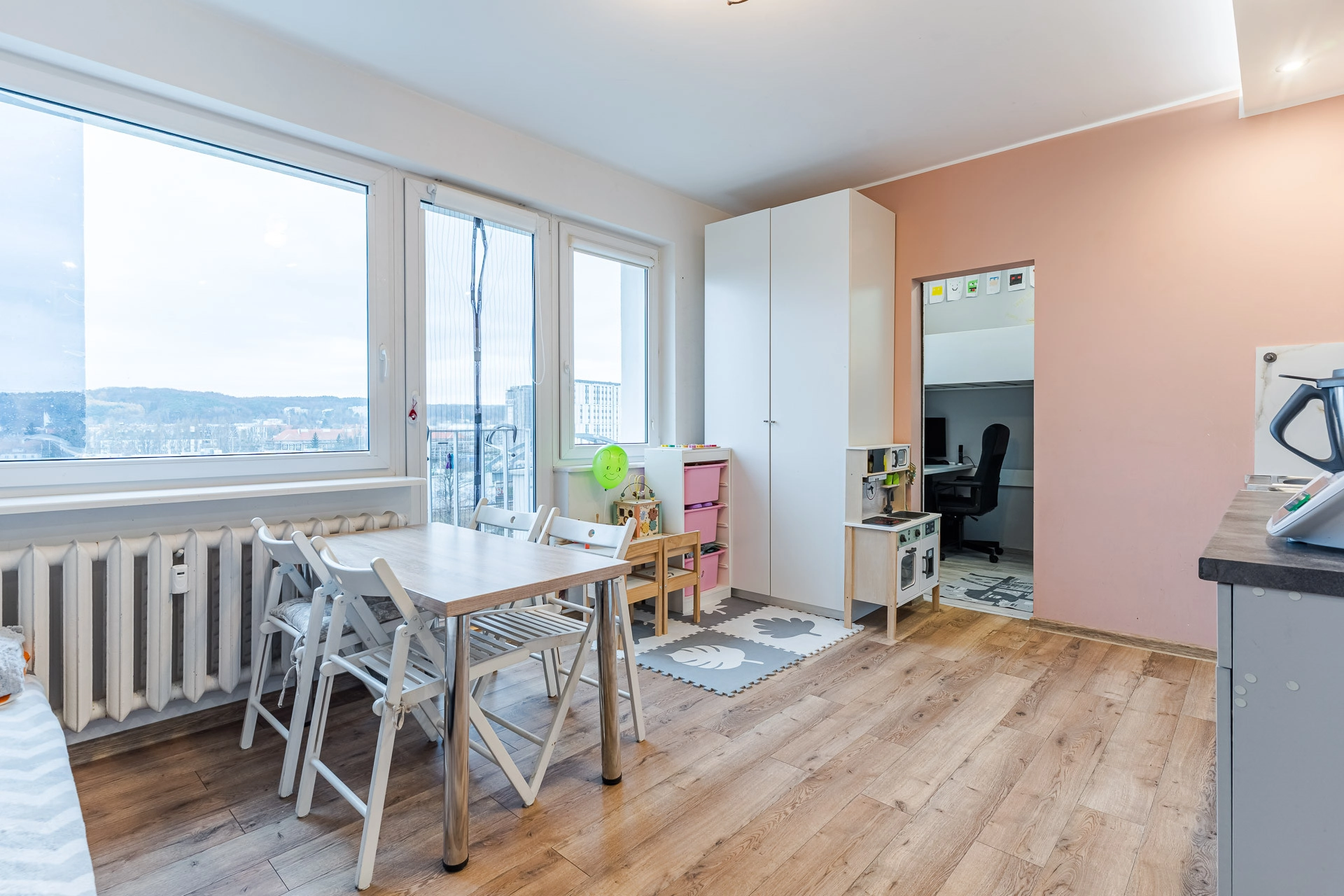 Okna PCV, na podłogach parkiet oraz terakota