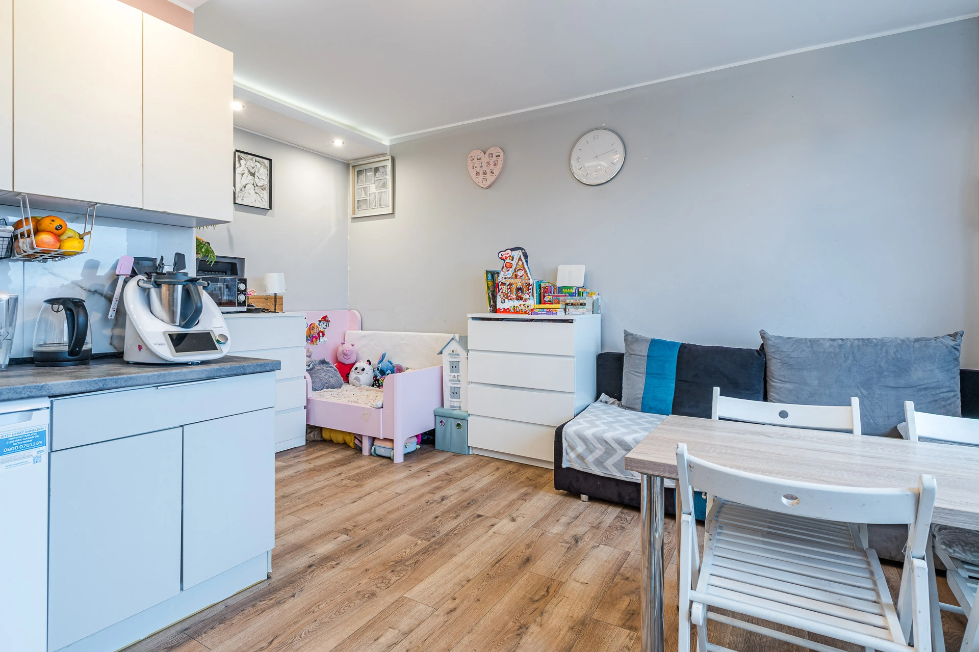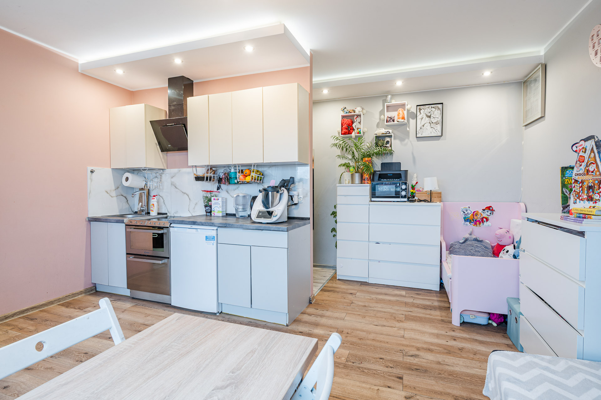 – pokoj  dzienny z anelsem kuchennym, umblowany i wyposażony w sprzę AGD
