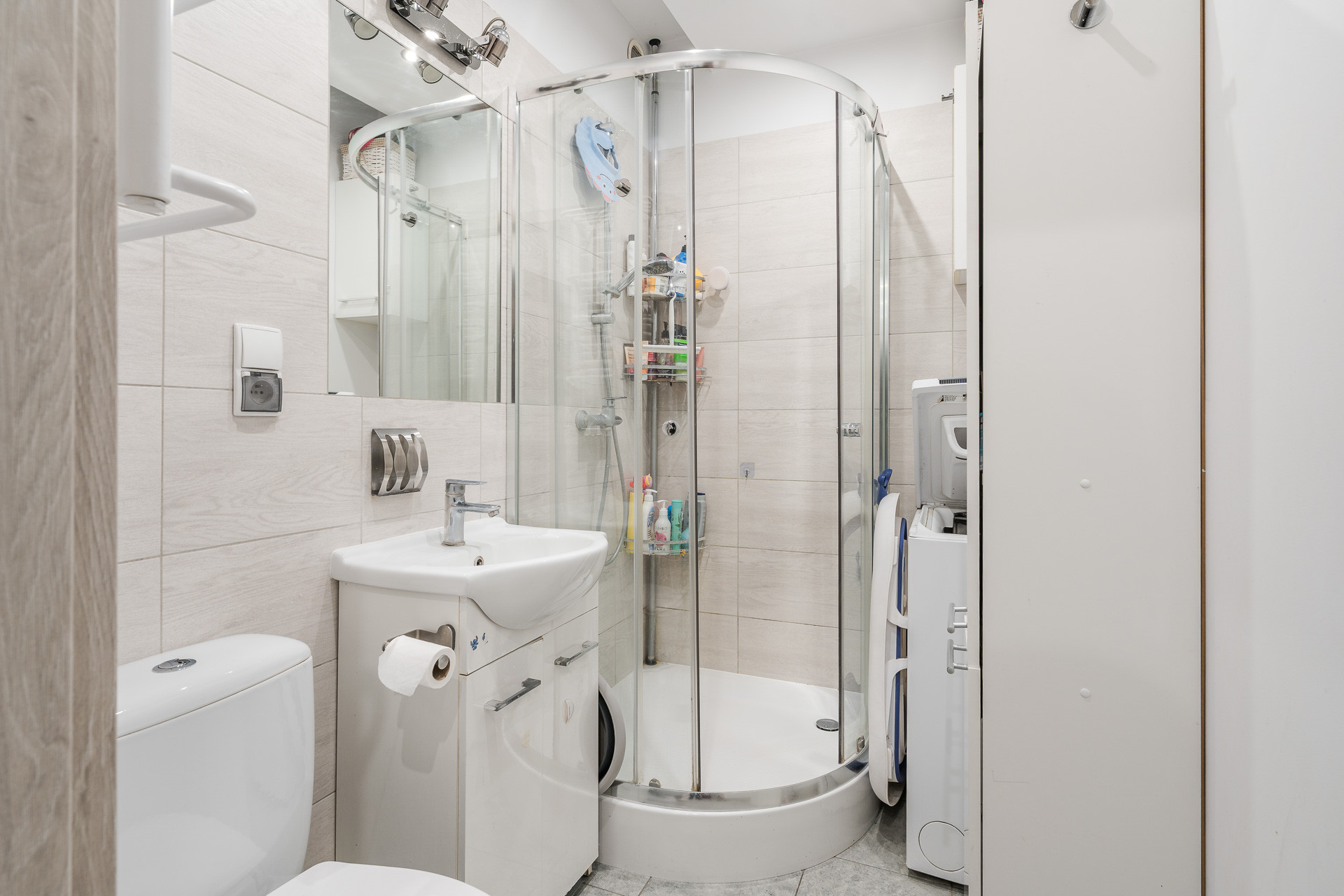 – łazienka z kabiną prysznicową, umywlka z szaafką, pralka.