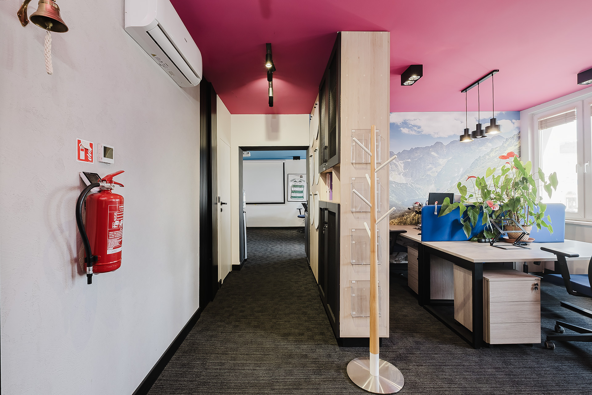 -Sali głównej z małym aneksem kuchennym i wyjściem na balkon – przestronnej i dobrze doświetlonej, idealnej jako główne biuro lub sala spotkań (ok.44m2)