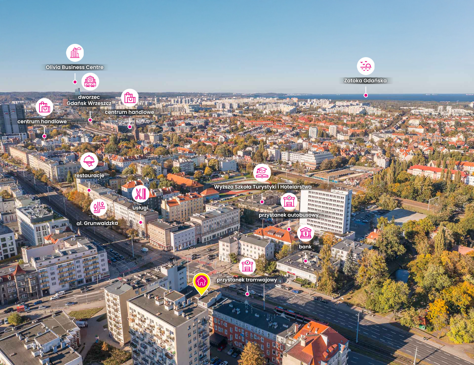Oferowany lokal znajduje się w jednej z najbardziej pożądanych dzielnic Gdańska – Wrzeszczu, bezpośrednio przy ul. Grunwaldzkiej, głównej arterii komunikacyjnej Trójmiasta. Liczne przystanki tramwajowe i autobusowe tuż przy budynku oraz kilkuminutowy spacer do stacji SKM Gdańsk Wrzeszcz gwarantują szybki i wygodny dojazd – zarówno dla pracowników, jak i klientów. W bezpośrednim sąsiedztwie znajdują się uczelnie wyższe (Politechnika Gdańska, Uniwersytet Gdański, GUMed), co stanowi istotną zaletę dla firm współpracujących z sektorem edukacji, nauki czy poszukujących wykwalifikowanych specjalistów.