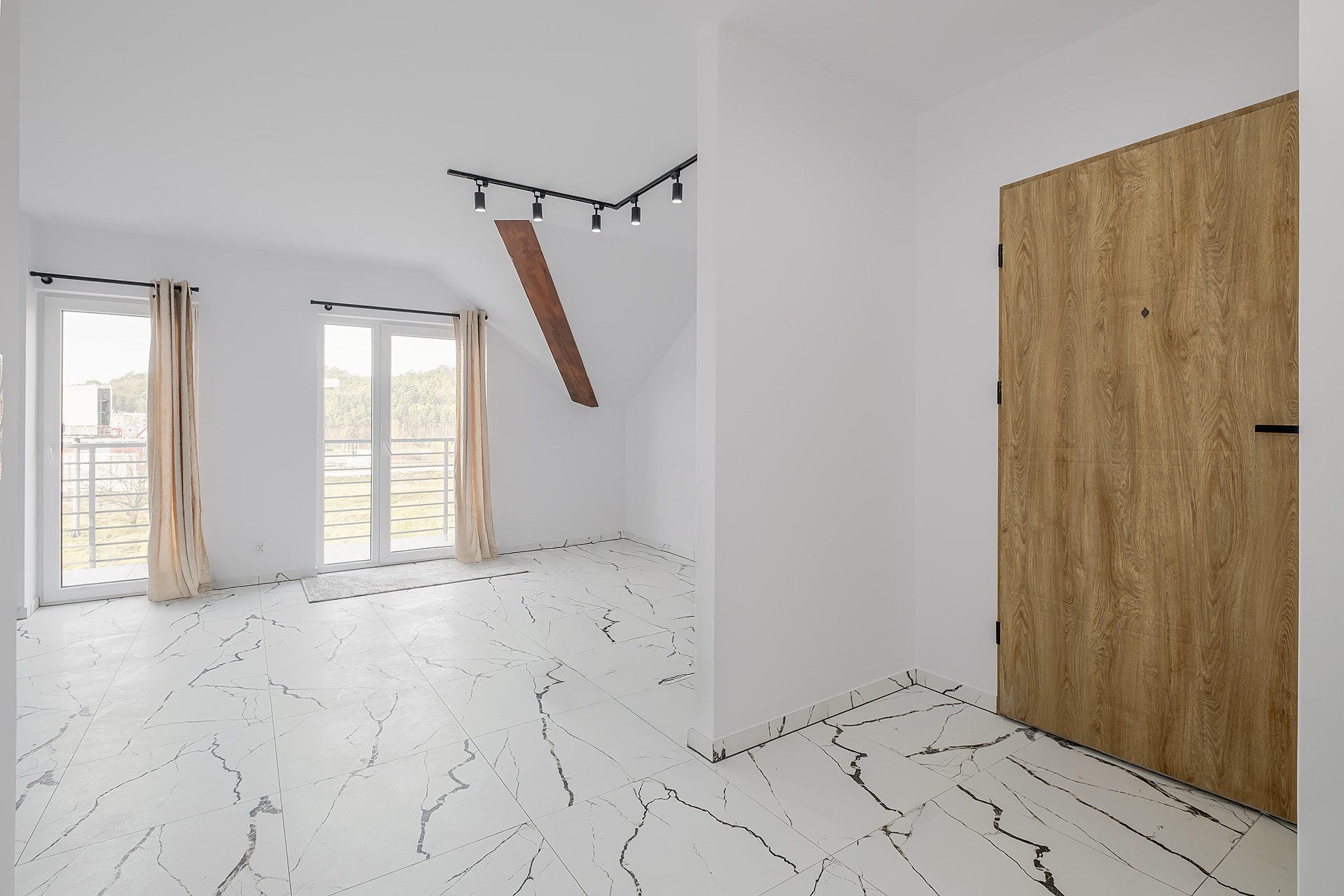 Mieszkanie o powierzchni 65,35 m² znajduje się na drugim, ostatnim piętrze budynku. Składa się z przestronnego salonu z aneksem kuchennym, dwóch sypialni, łazienki z toaletą, garderoby oraz przedpokoju. Do lokalu przynależy duży taras oraz poddasze o powierzchni około 60 m² po podłodze, przeznaczone do wyłącznego korzystania – idealne jako spiżarnia, suszarnia lub dodatkowa przestrzeń do przechowywania.