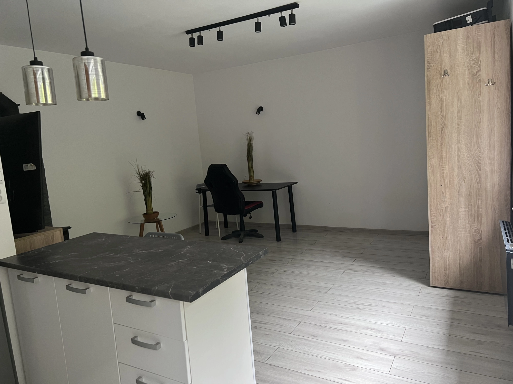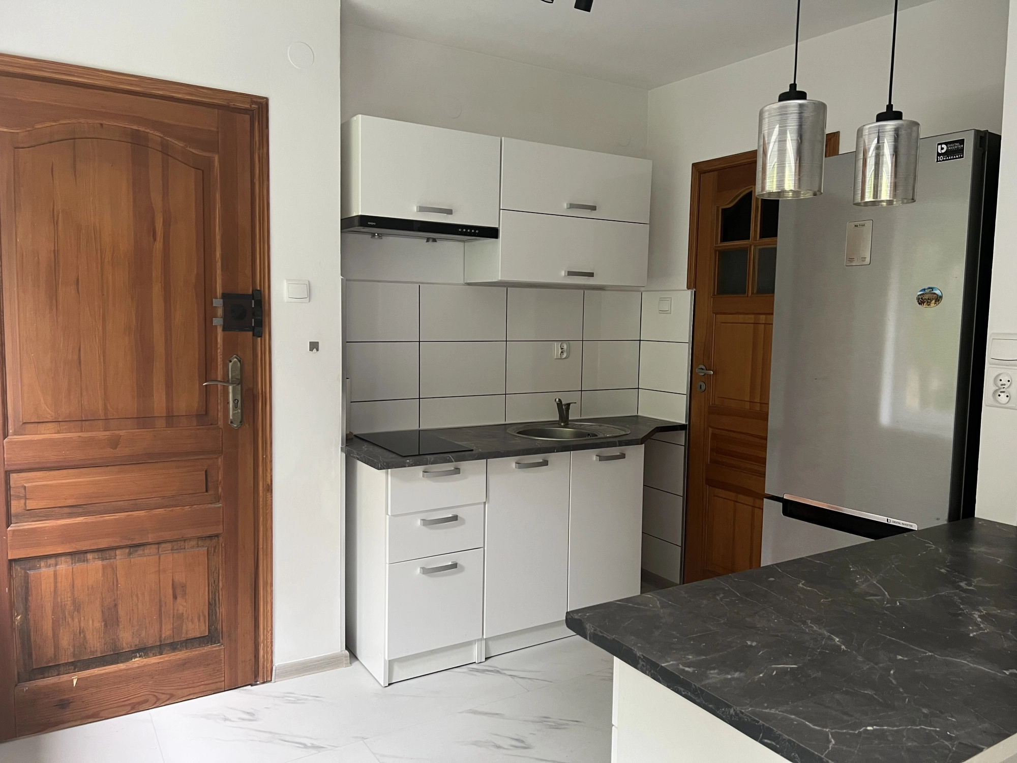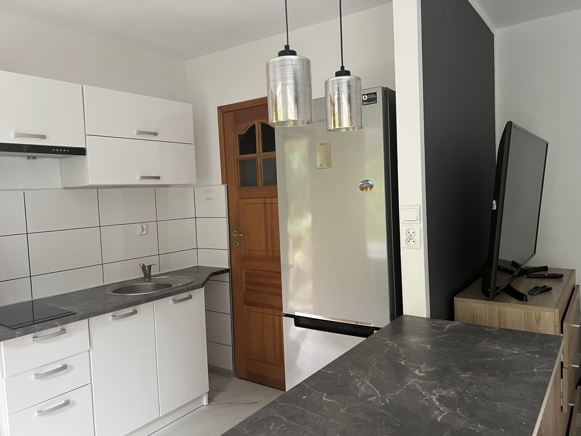 Częściowo wyposażone, umeblowana kuchnia z lodówką.