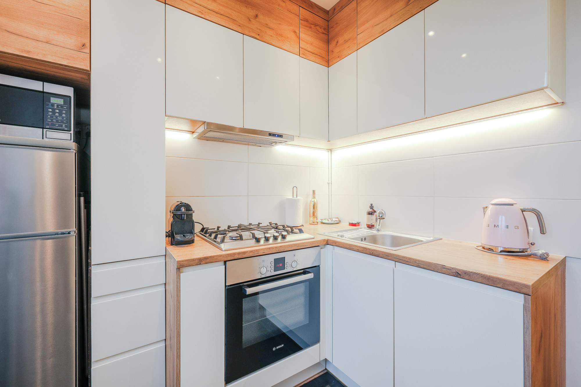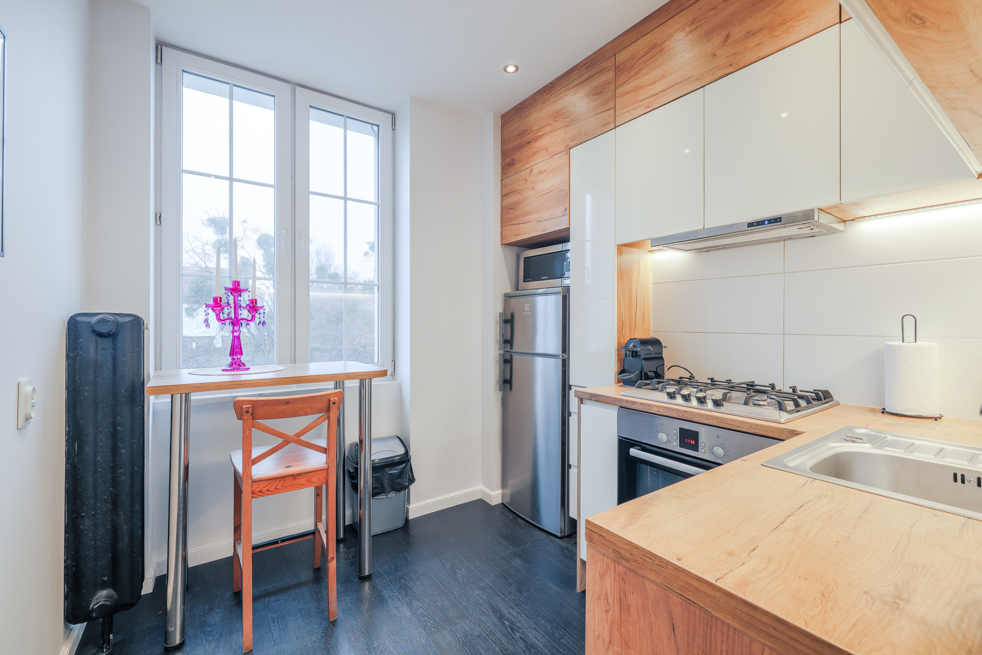 – kuchnia (5,94 m2) z meblami w zabudowie, sprzętem AGD i oknem,