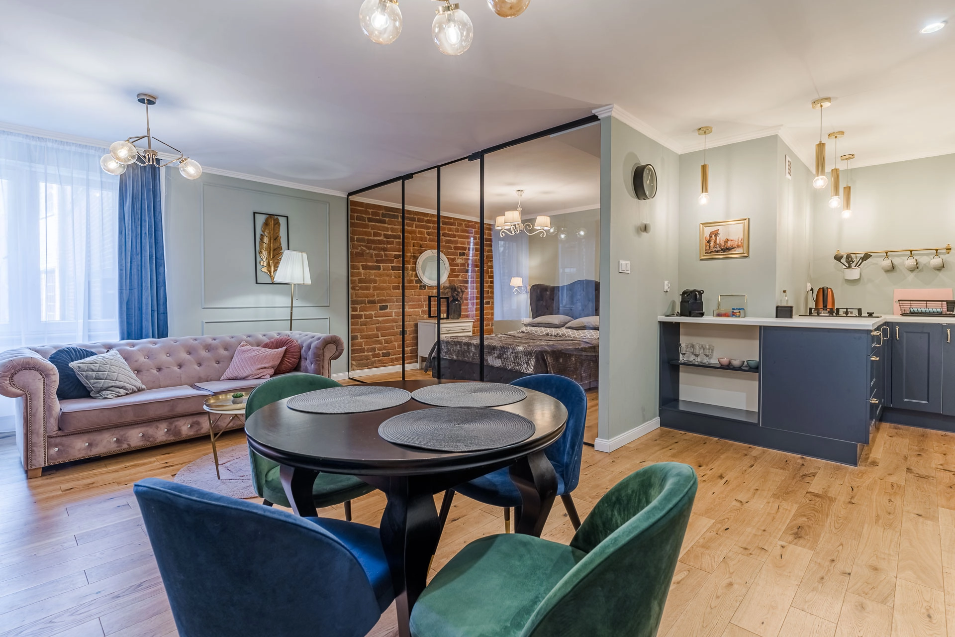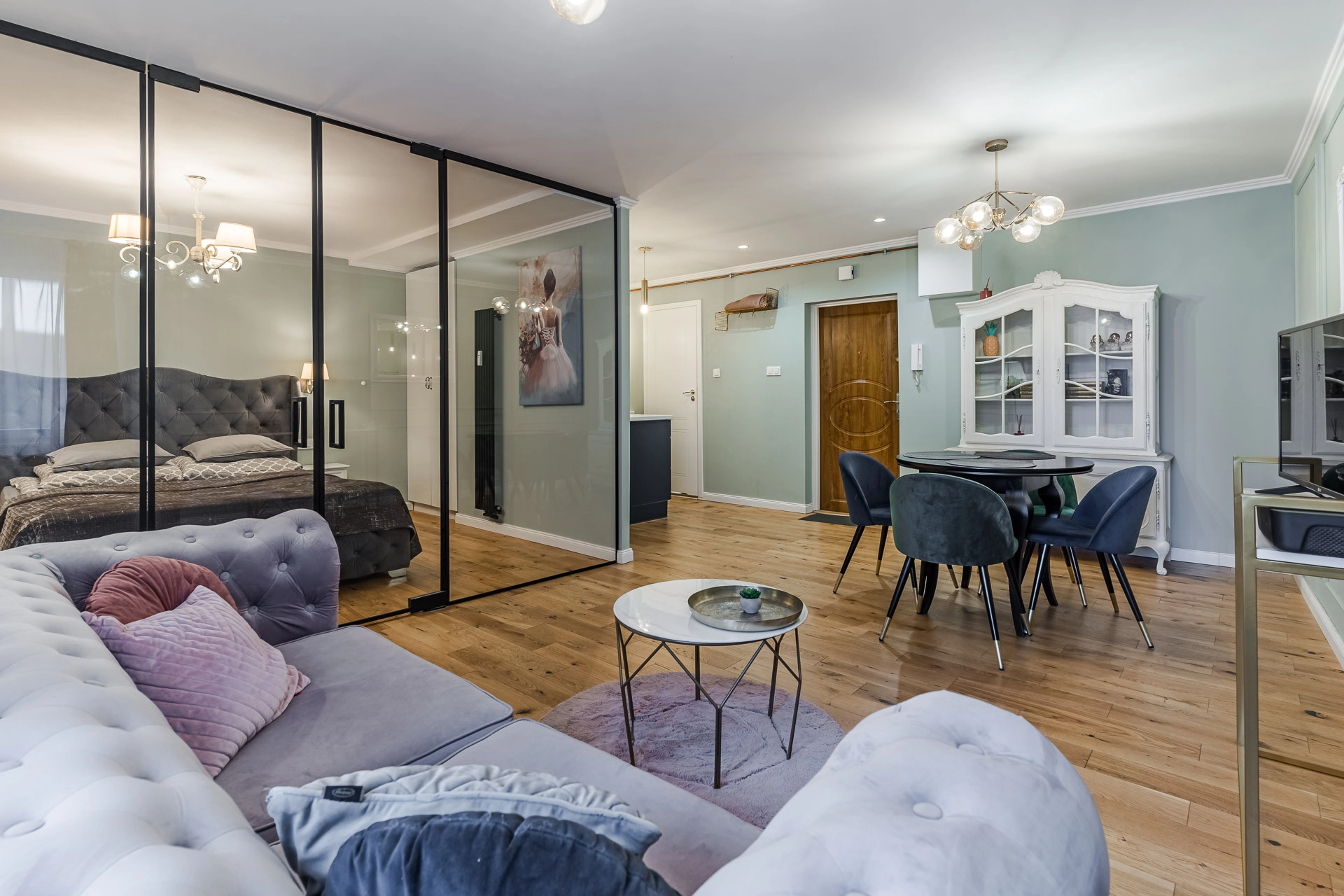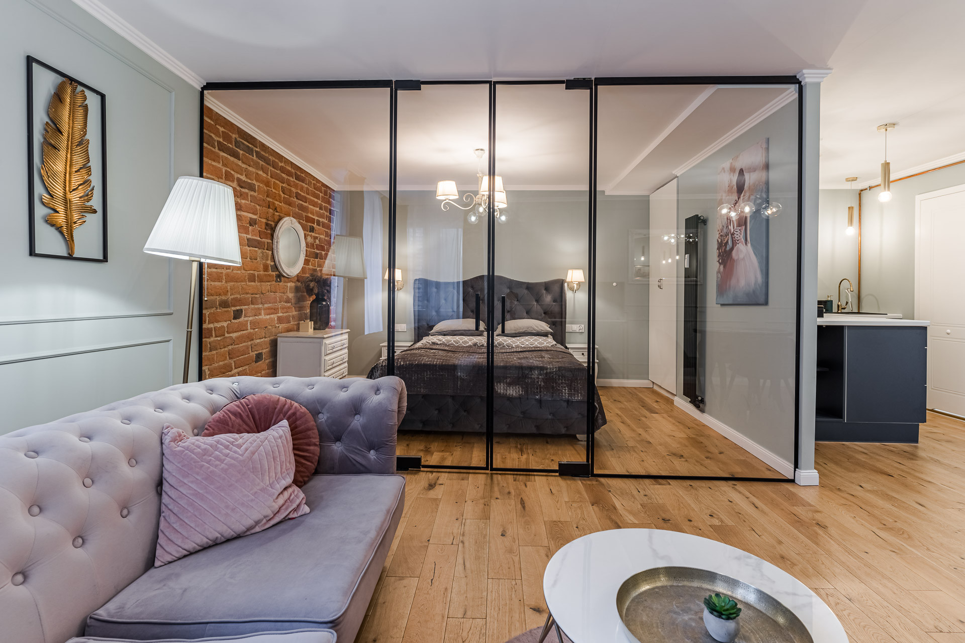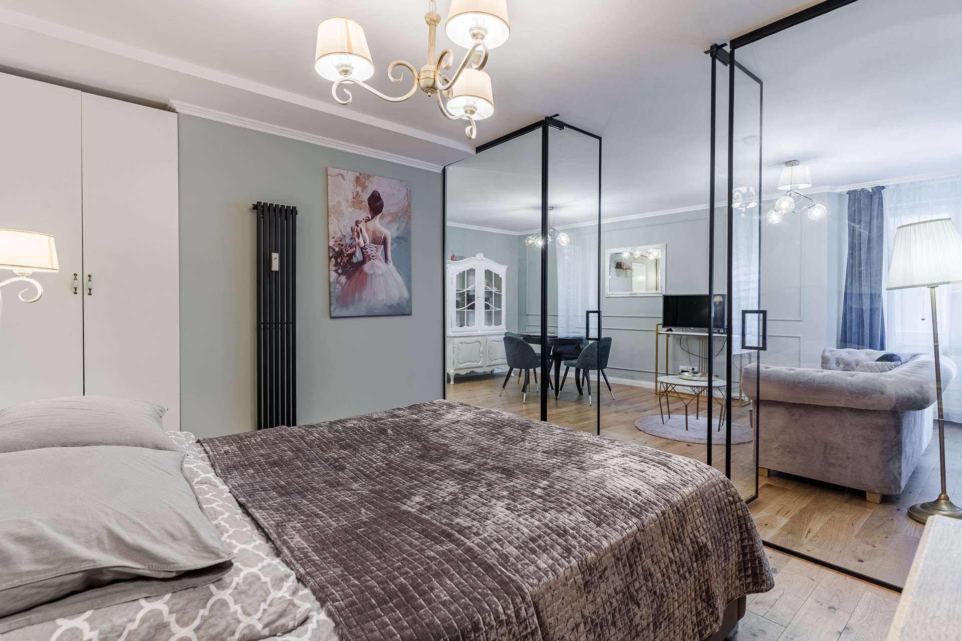 – wydzielony, przeszklony aneks sypialniany (10,70 m2) z szafą w zabudowie,