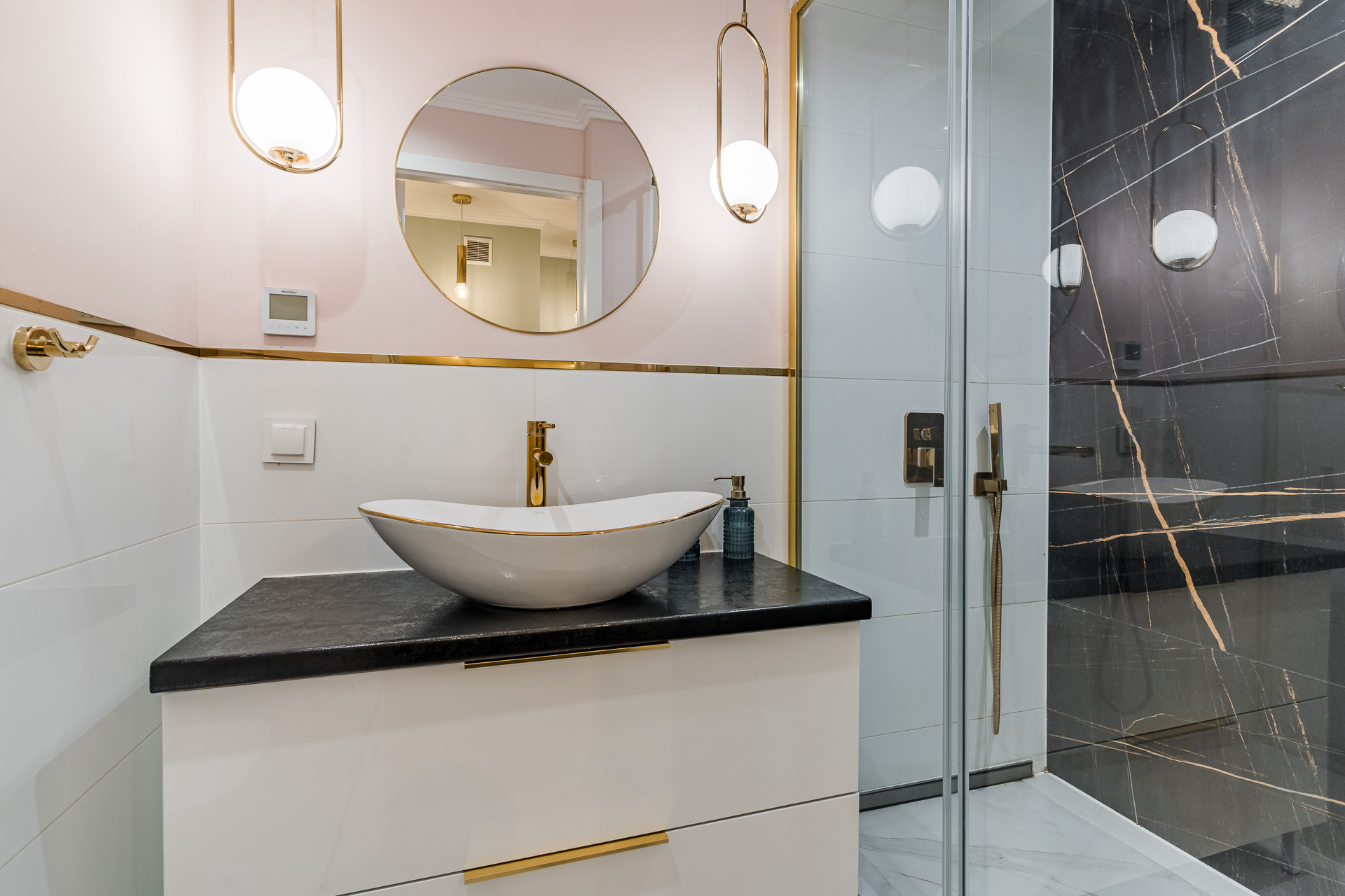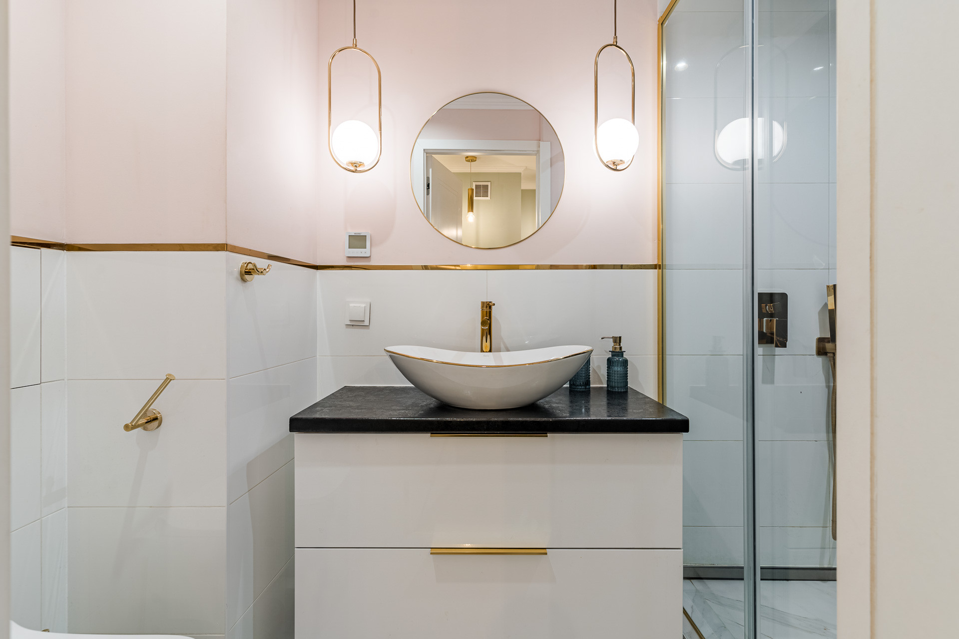 – łazienka (2,78 m2) z WC, prysznicem, umywalką, lustrem.
