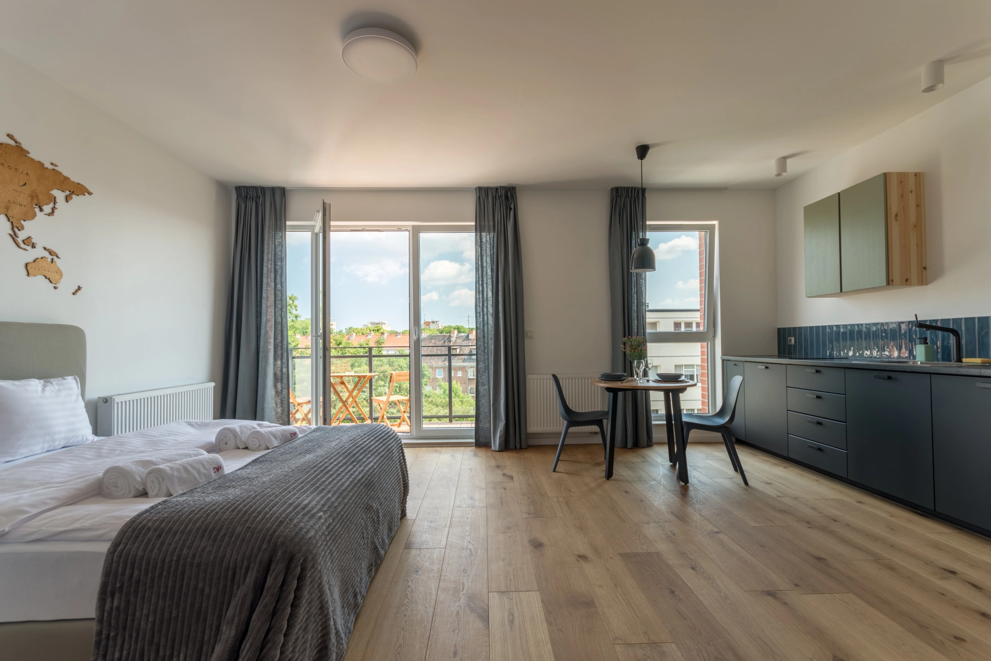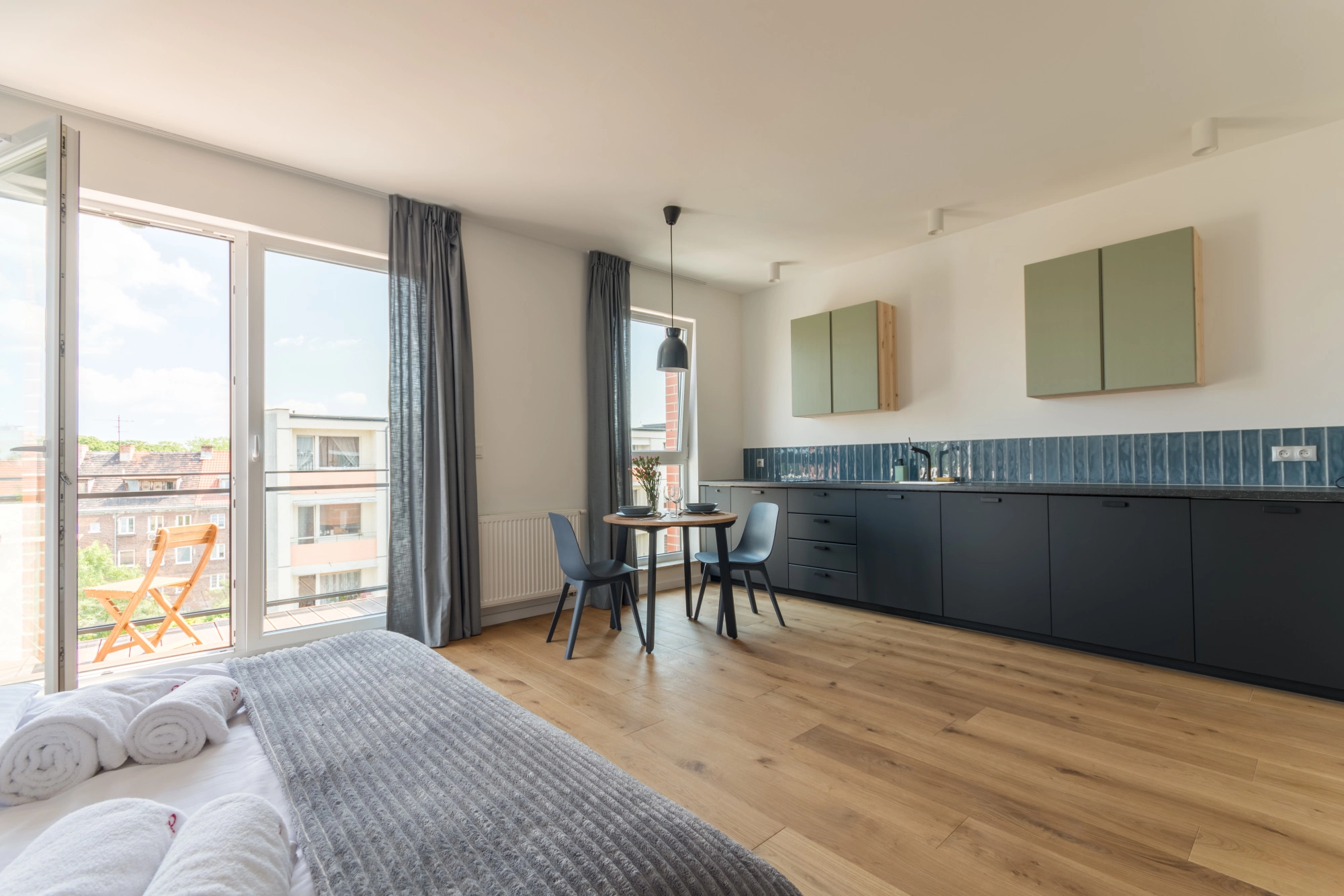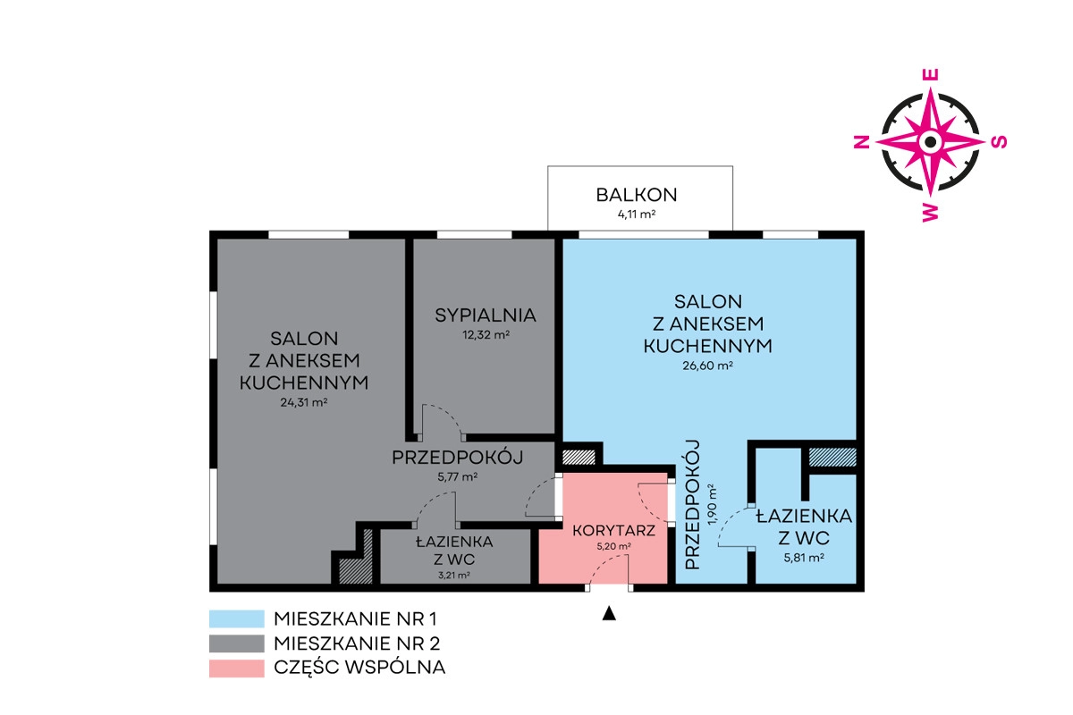 – pokój z aneksem kuchennym (łącznie 26,60 m2) oraz wyjściem na balkon (4,11 m2),