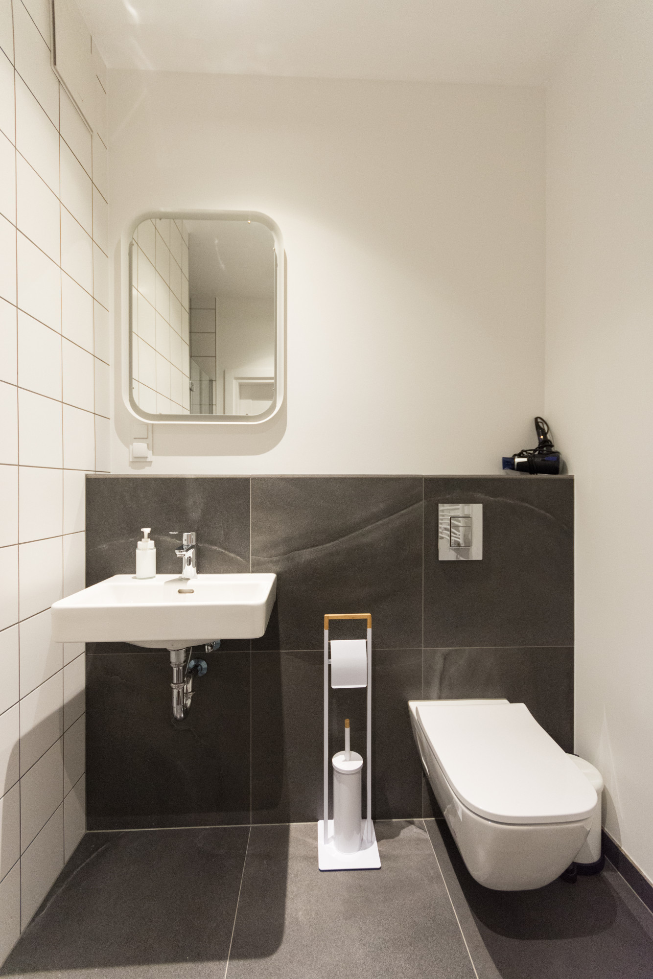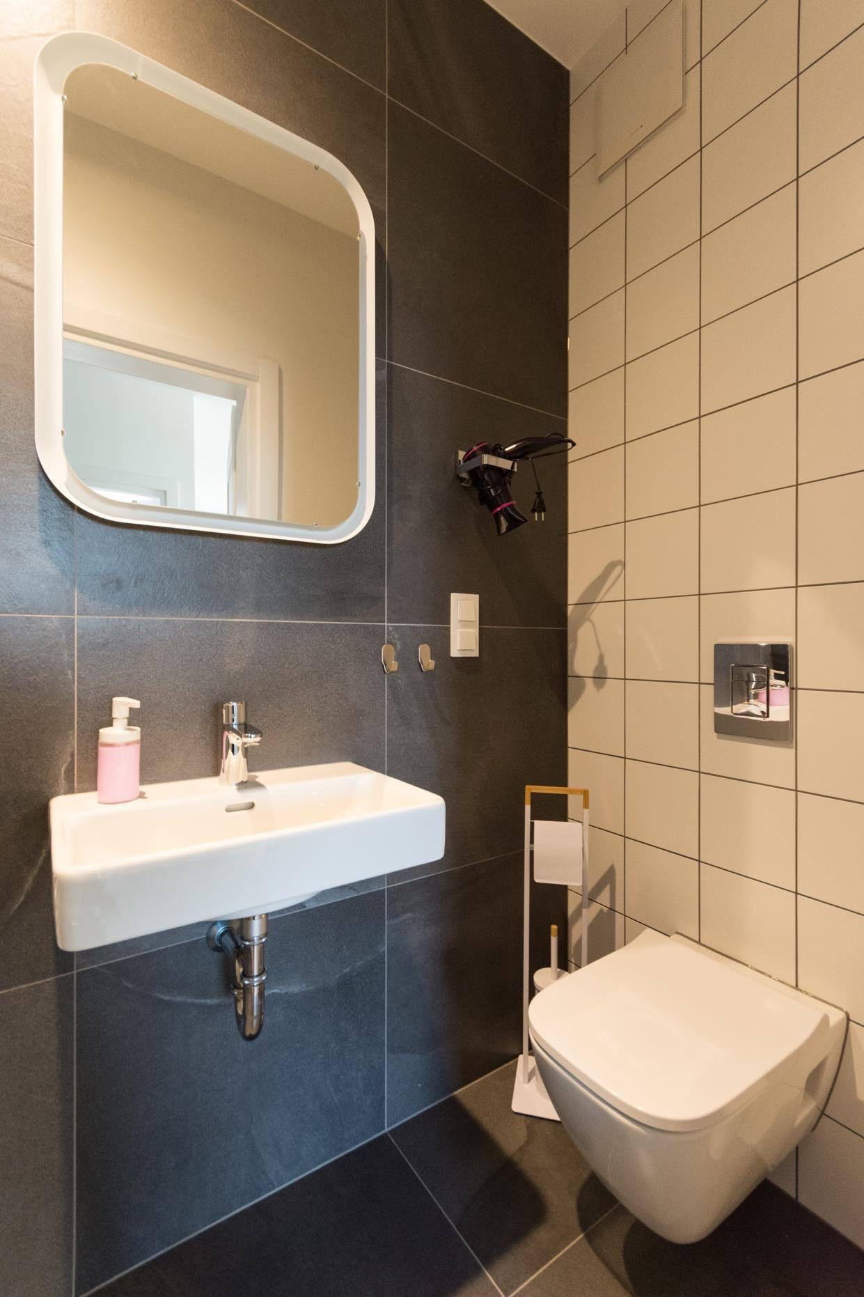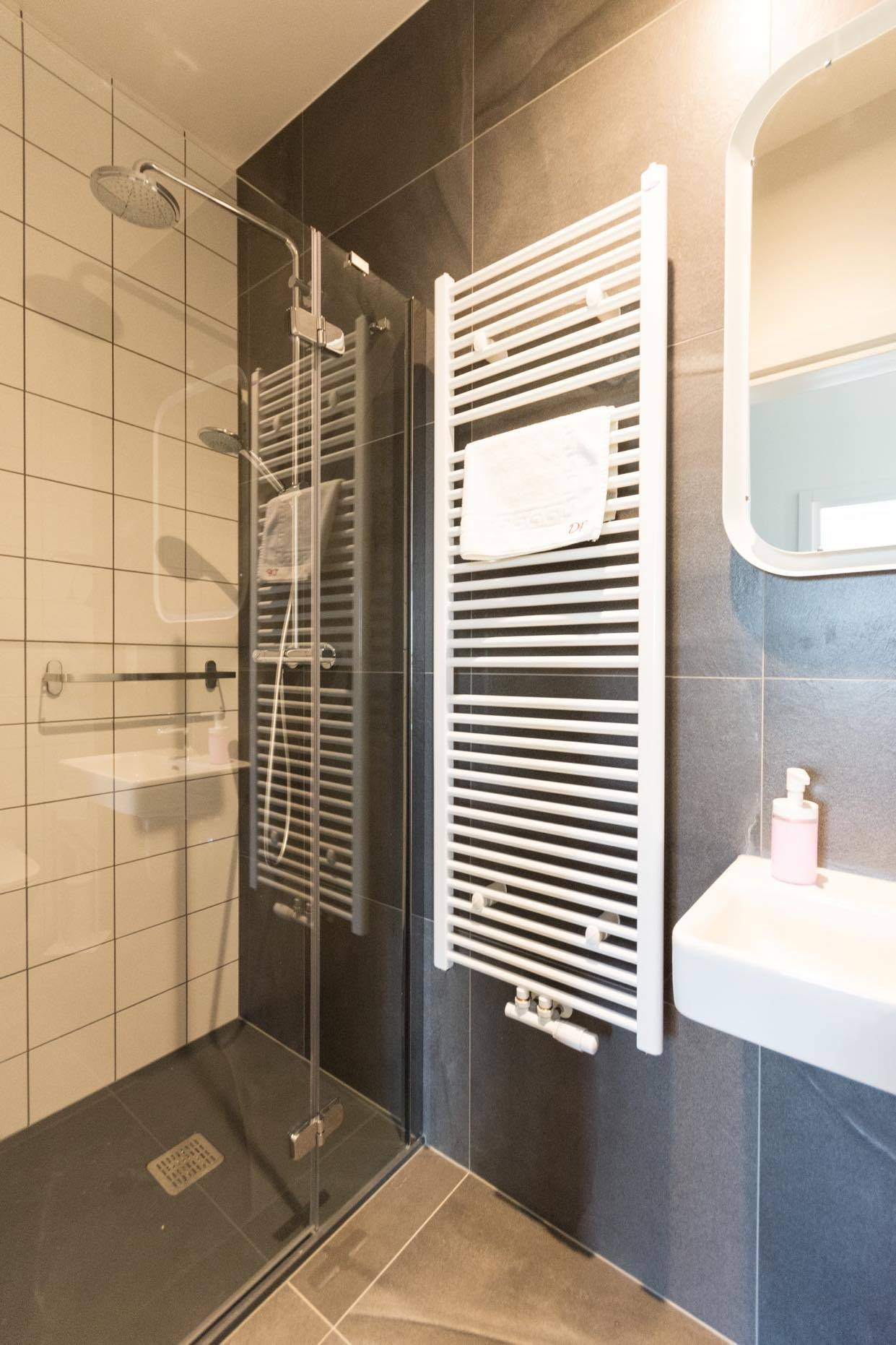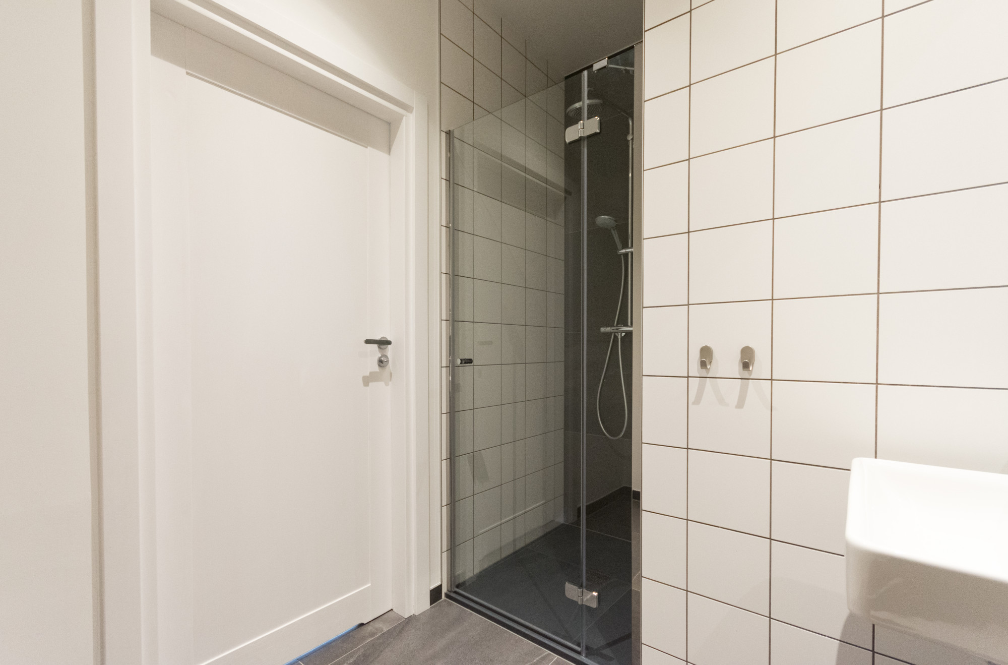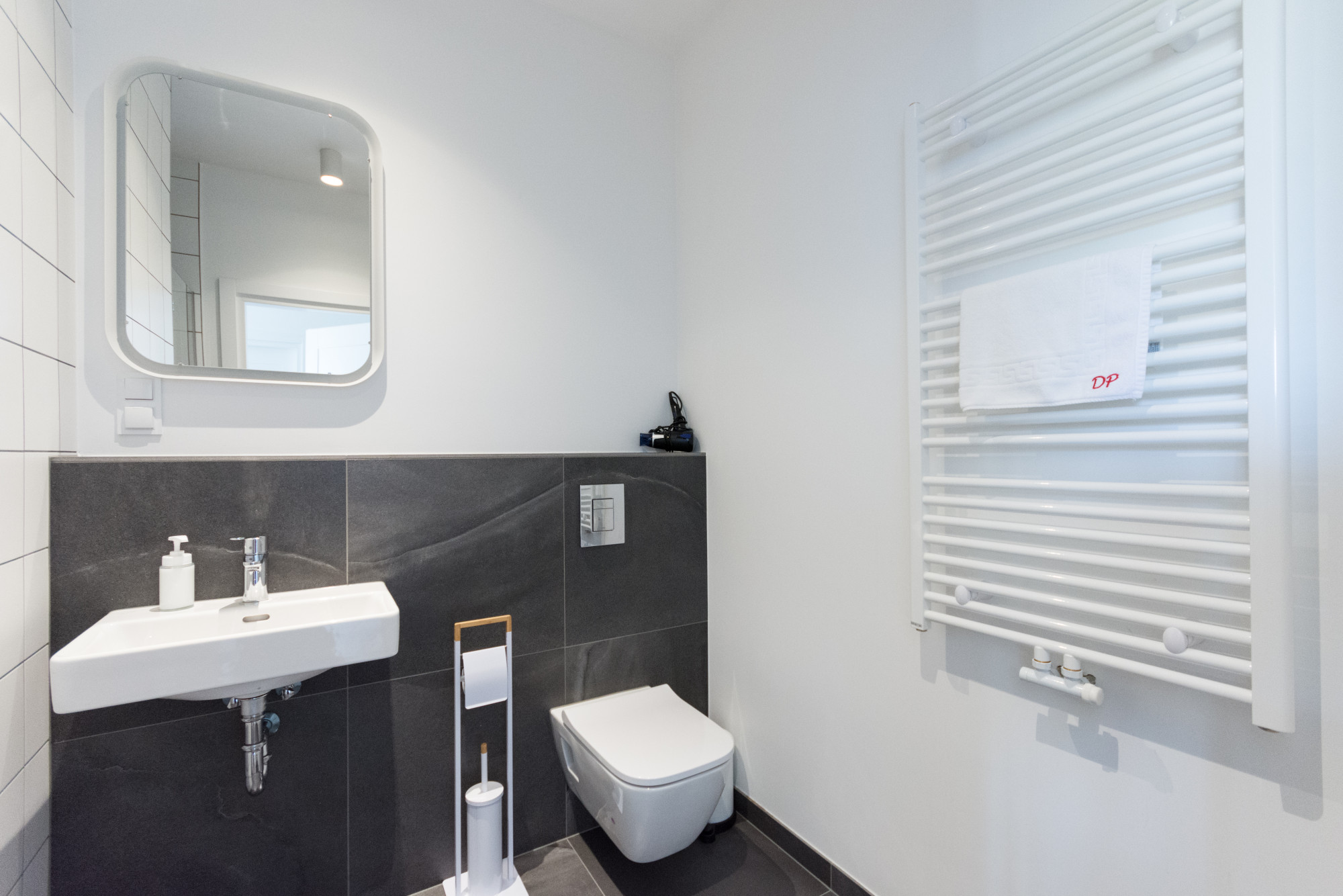 – łazienka (3,21 m2) z WC, prysznicem, umywalką, lustrem, grzejnikiem drabinkowym,