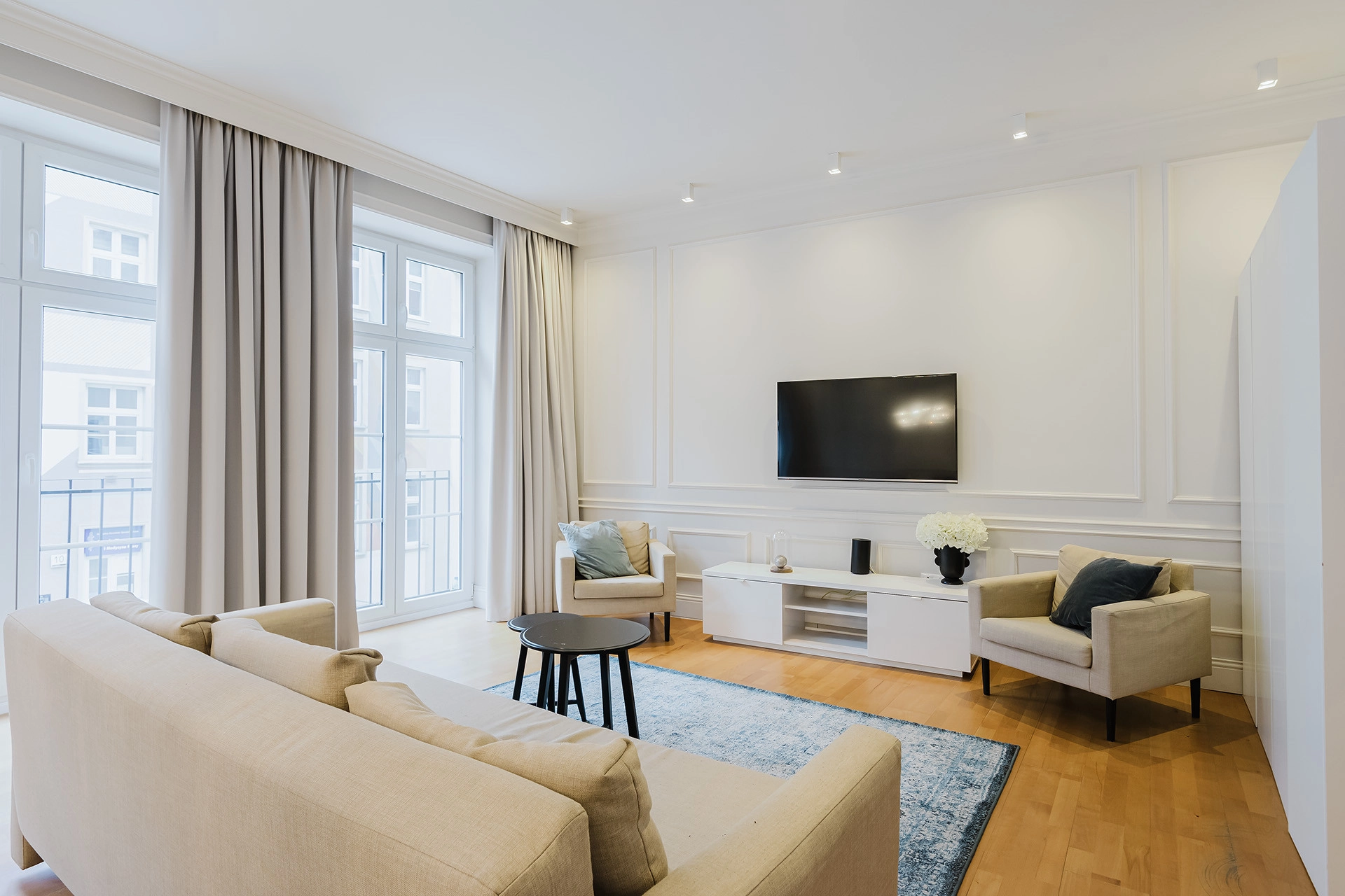 -Wysokie sufity (ok. 3 m) i ogromne okna w salonie od strony południowej – mieszkanie jest jasne, przestronne i atrakcyjne na zdjęciach promujących wynajem,