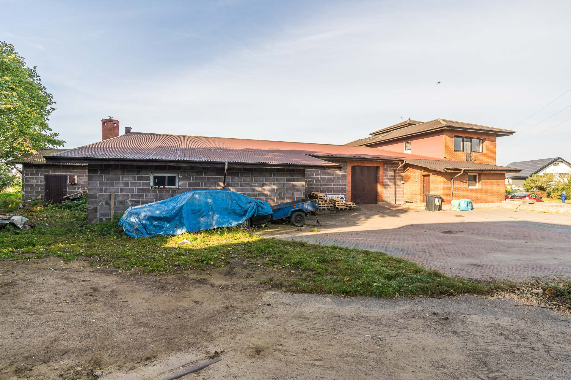 Podjazd do budynku wyłożony kostką, szeroka brama na parterze bezpośrednio otwierana na halę. Duży plac przed budynkiem.
