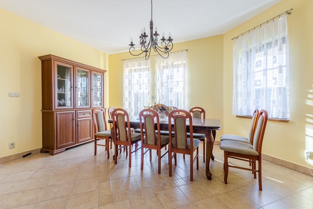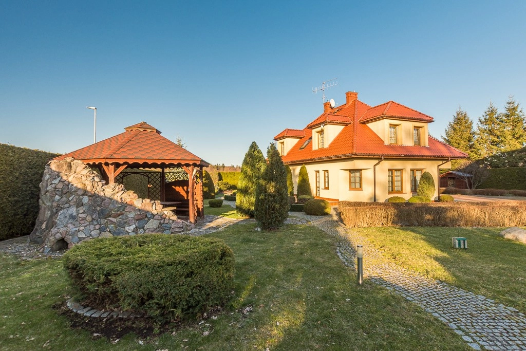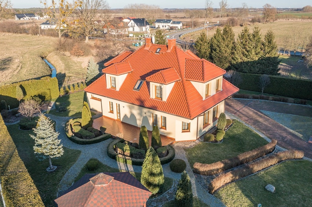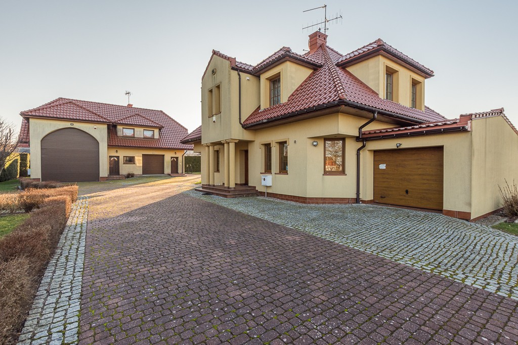 jeden o powierzchni 260 m2, drugi również ok. 260 m2. Domy wybudowane z pustaków, elewacja w bardzo dobrym stanie. Dach pokryty dachówką ceramiczną Roben, okna PCV. Ogrzewanie gazowe za pomocą dwufunkcyjnych pieców gazowych, serwisowanych na bieżąco.