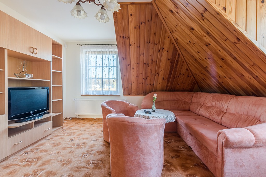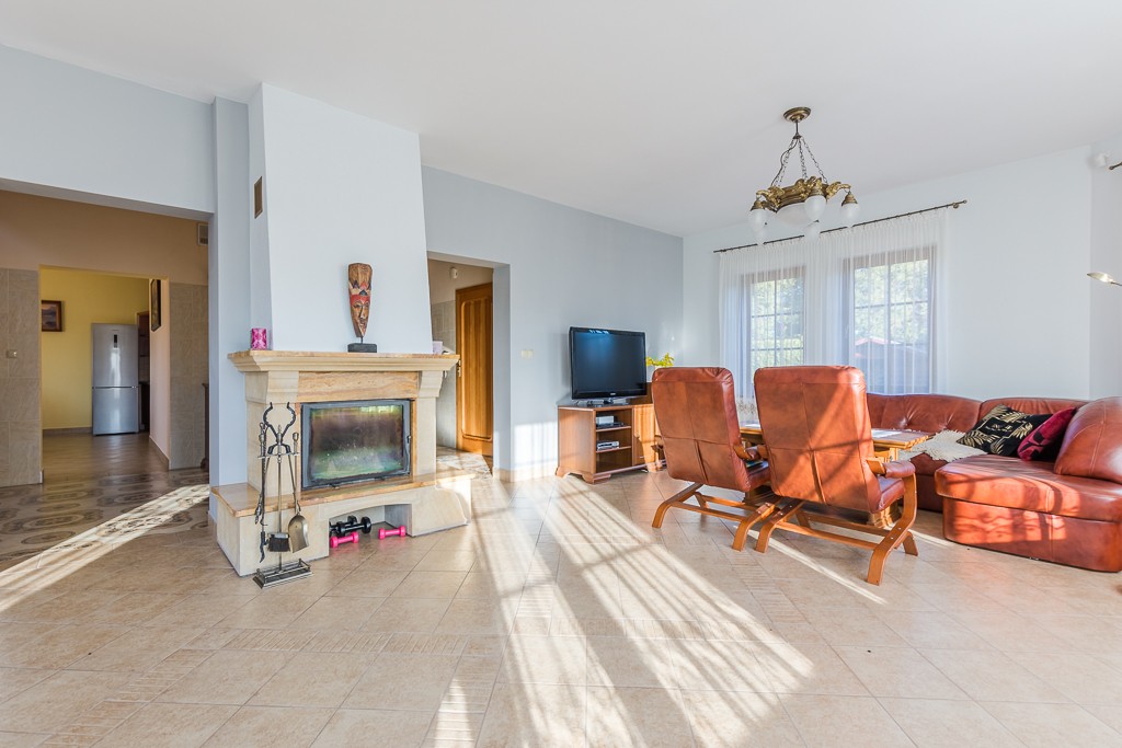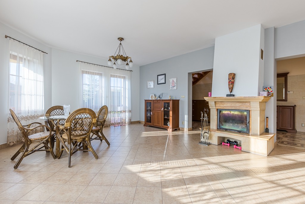 – słoneczny salon z kominkiem i wyjściem na taras,
