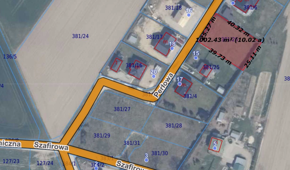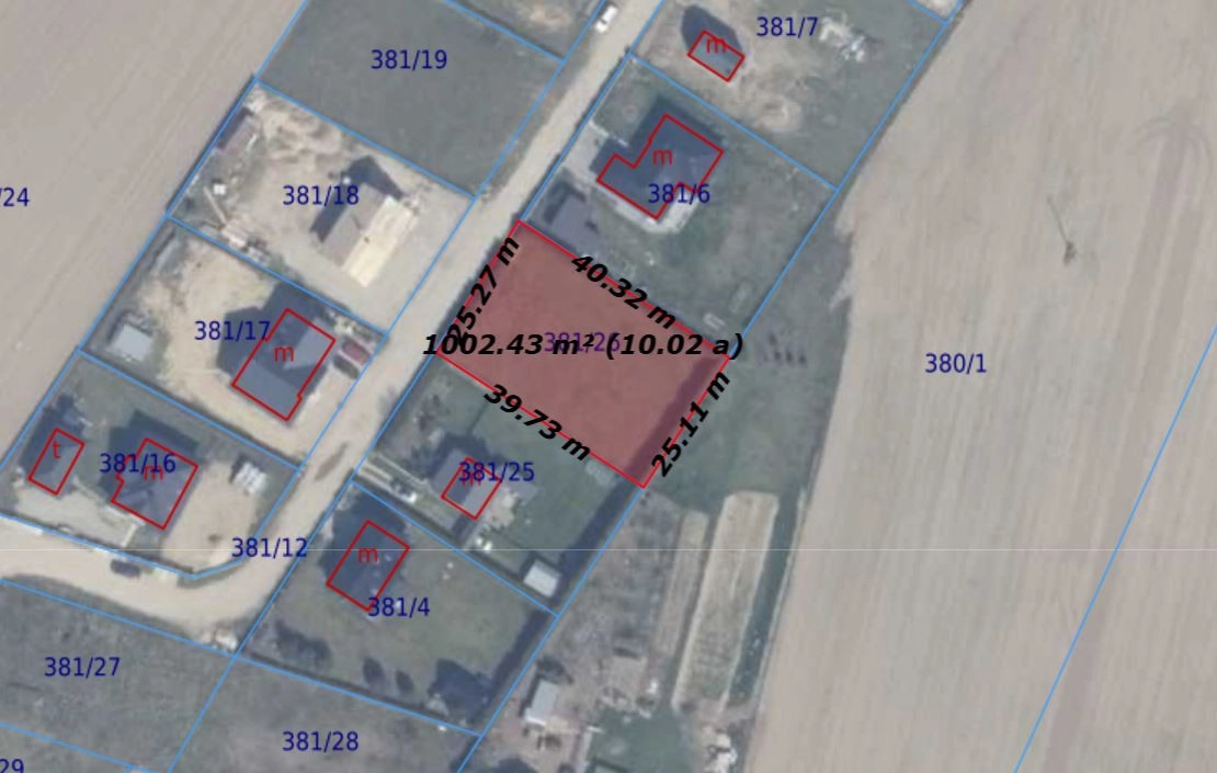 Działka nr 381/26 o powierzchni 1002 m2, w kształcie prostokąta, płaska – jest to teren bardzo wygodny do aranżacji.