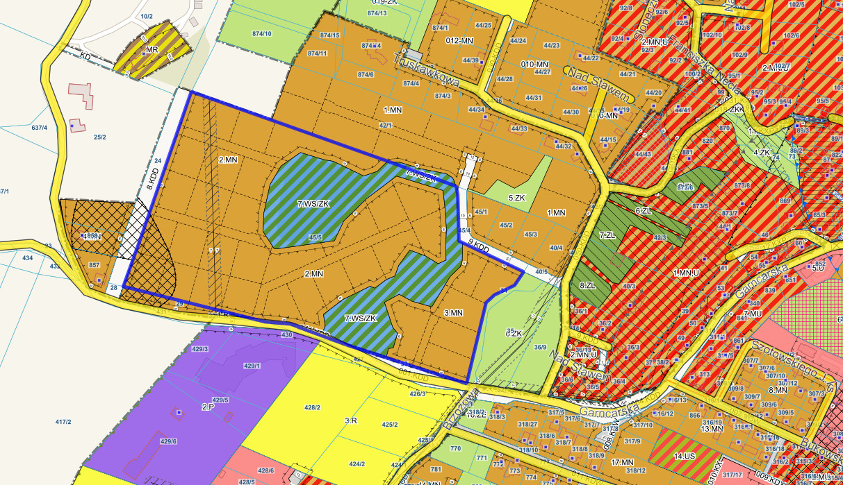 Zgodnie z uchwałą nr XXXVIII/355/2022 Rady Gminy w Chmielnie. Miejscowy Plan Zagospodarowania Przestrzennego (MPZP) przewiduję zabudowę mieszkaniową jednorodzinną. W przypadku wydzielania działek należy wydzielić też drogi wewnętrzne o minimalnej szerokości 8 m i/lub ciągi pieszo-jezdne wewnętrzne o minimalnej szerokości 6 m.