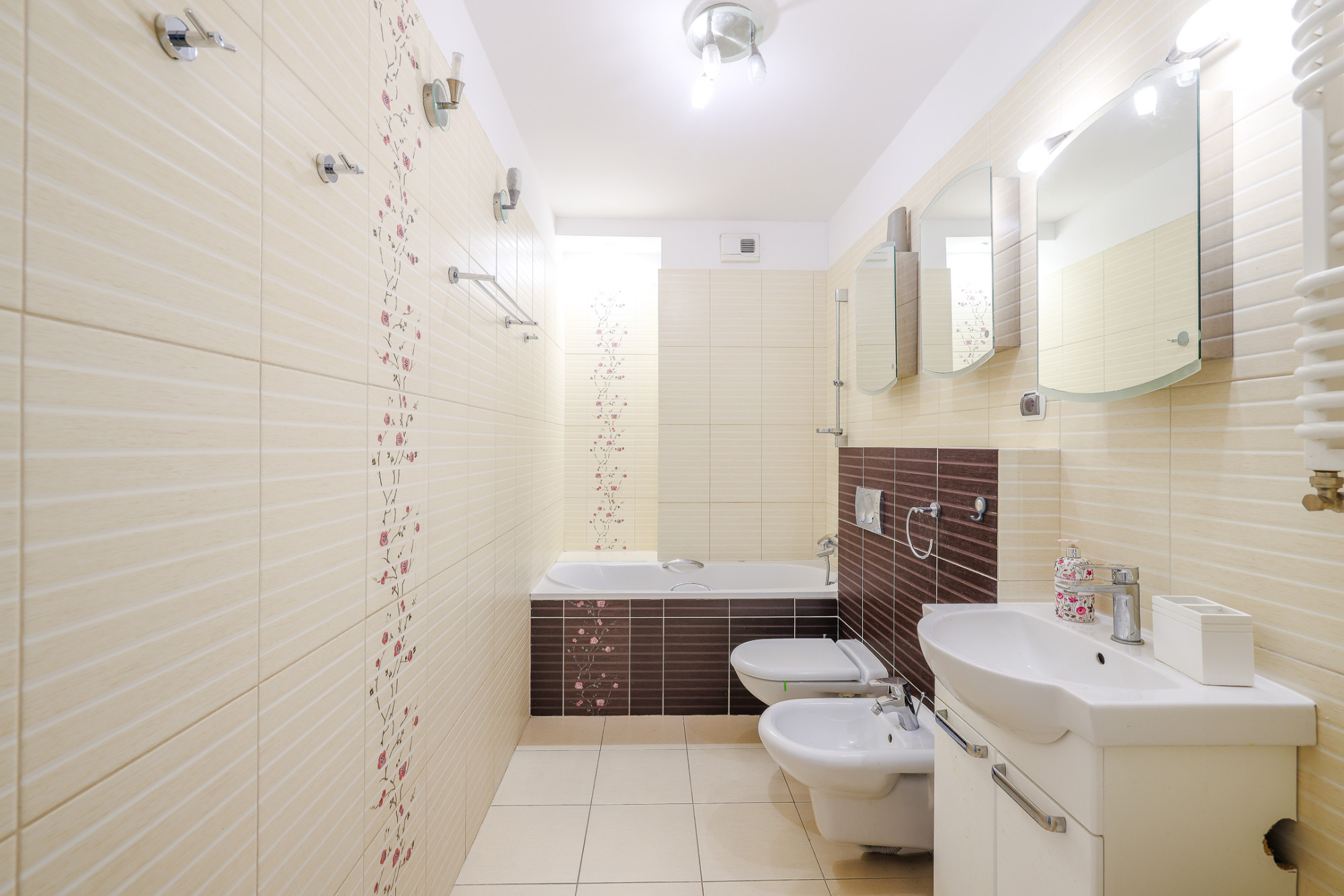 – łazienka z wanną, umywalką, lustrem oraz WC,
