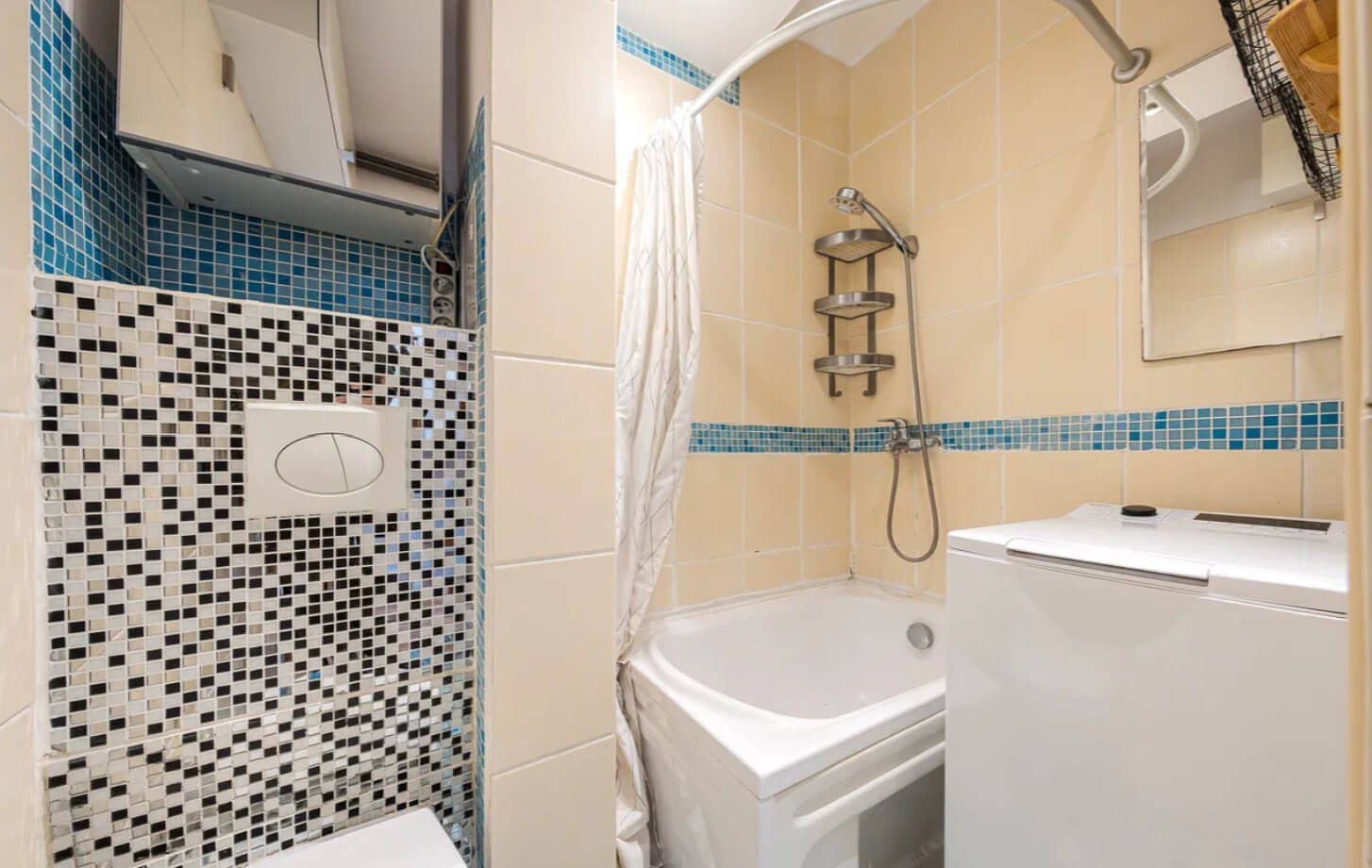 – łazienka z WC, prysznicem, lustrem, grzejnikiem drabinkowym.