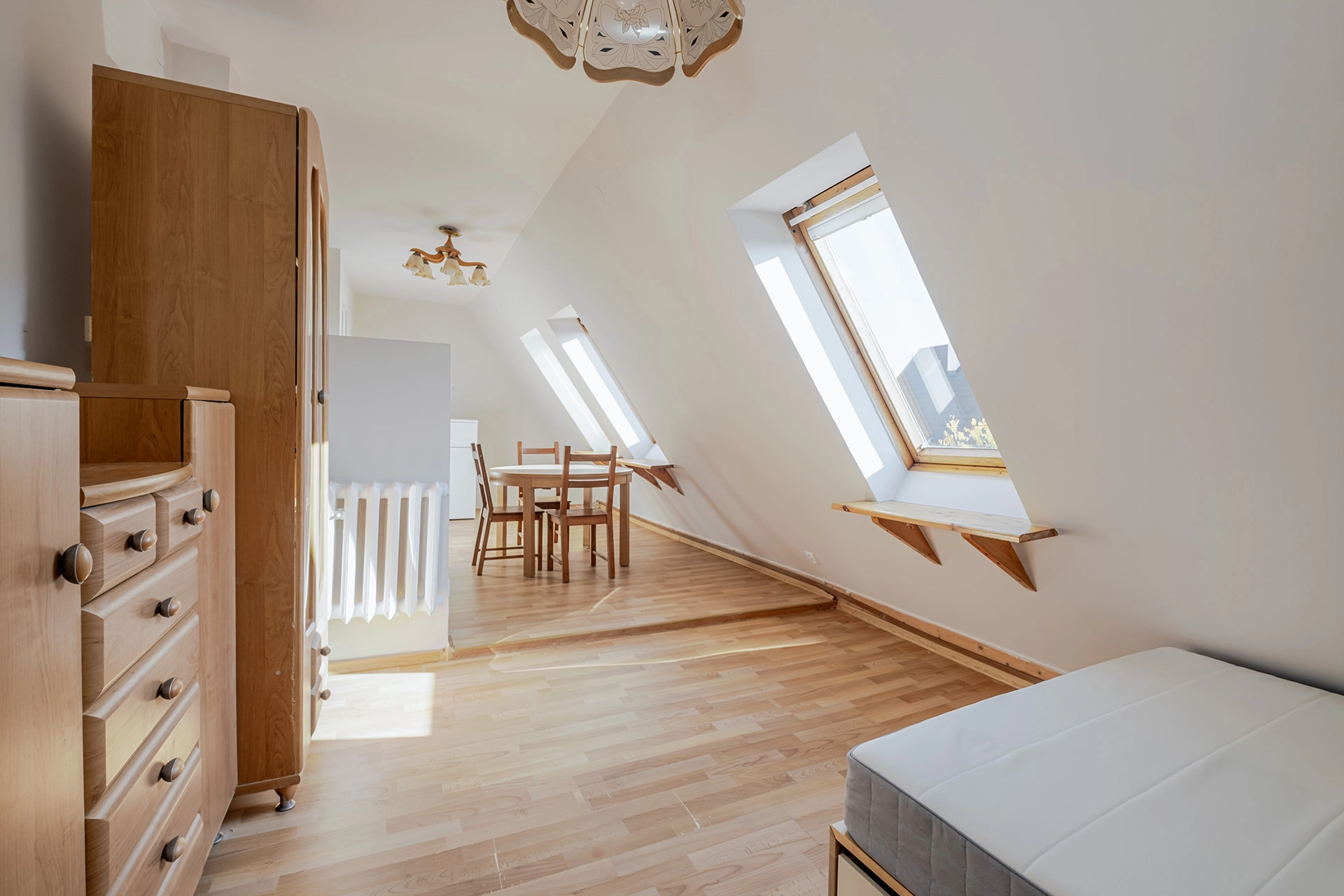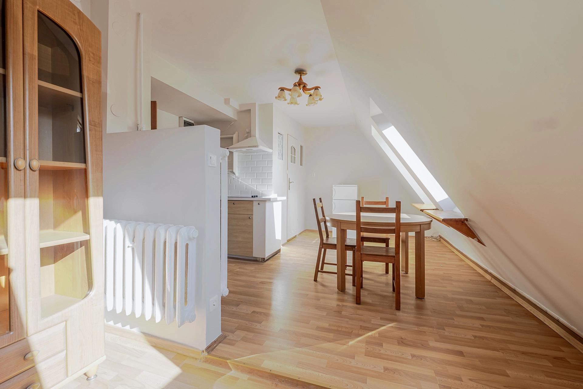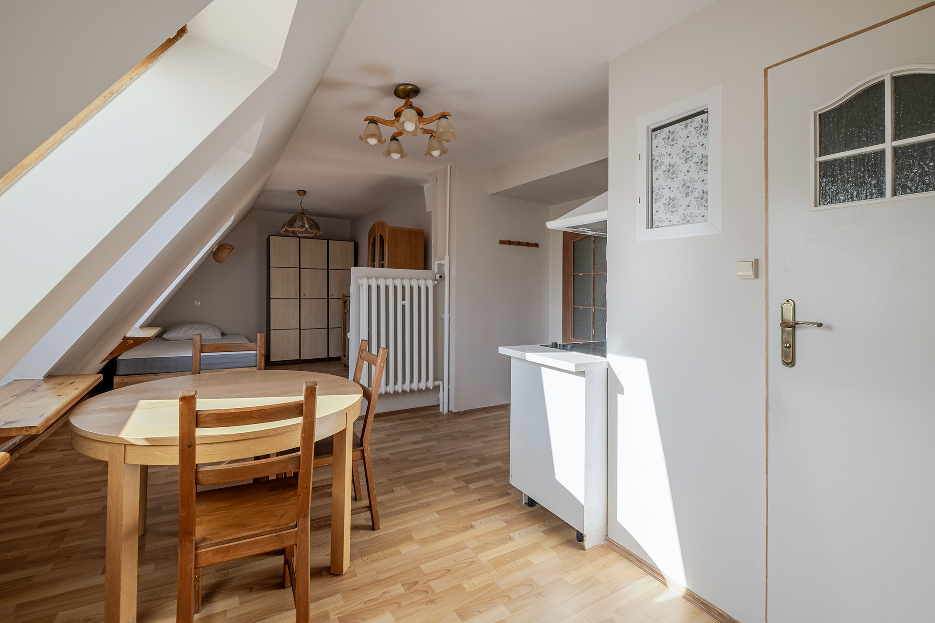 duży pokój z aneksem kuchennym oraz wydzieloną częścią sypialnianą i łazienką z prysznicem. Mieszkanie słoneczne z oknami dachowymi.