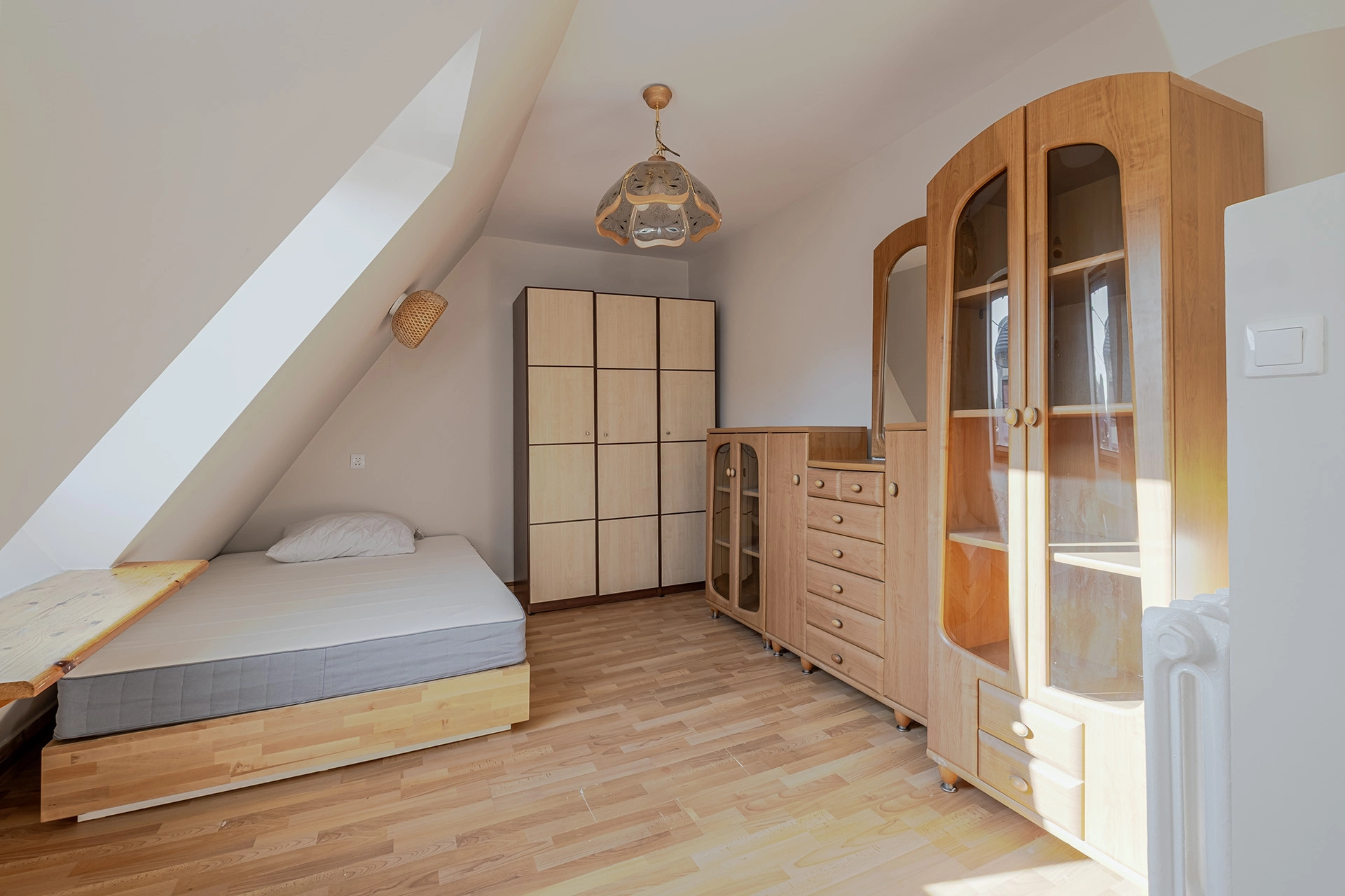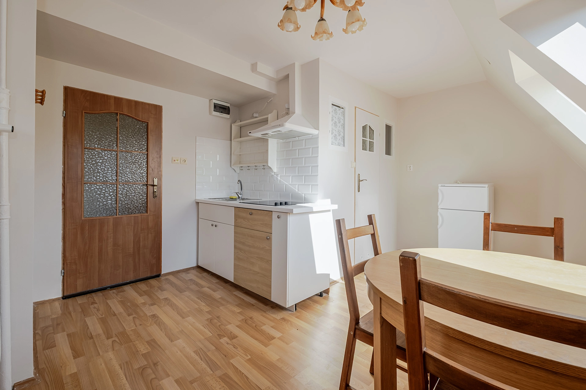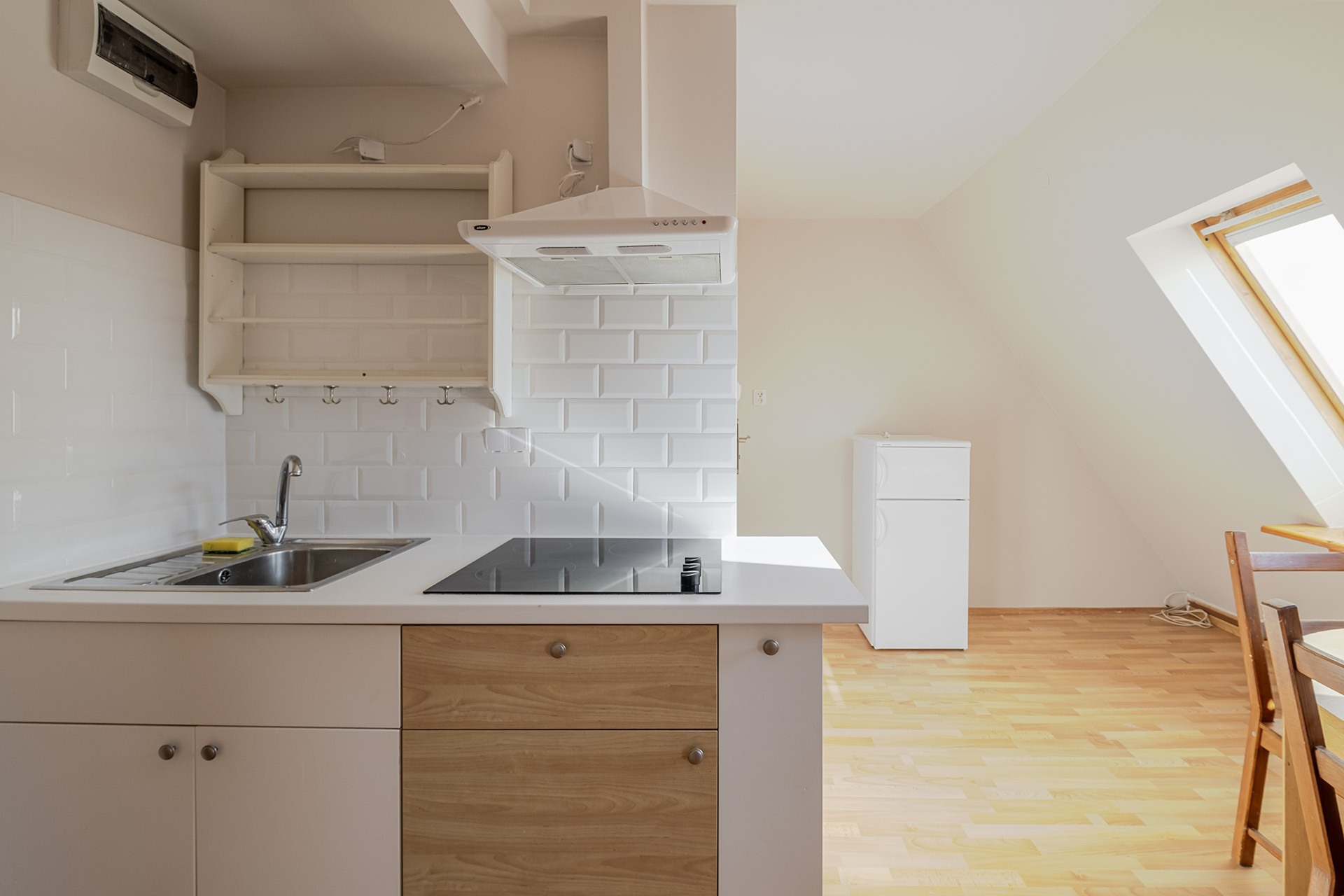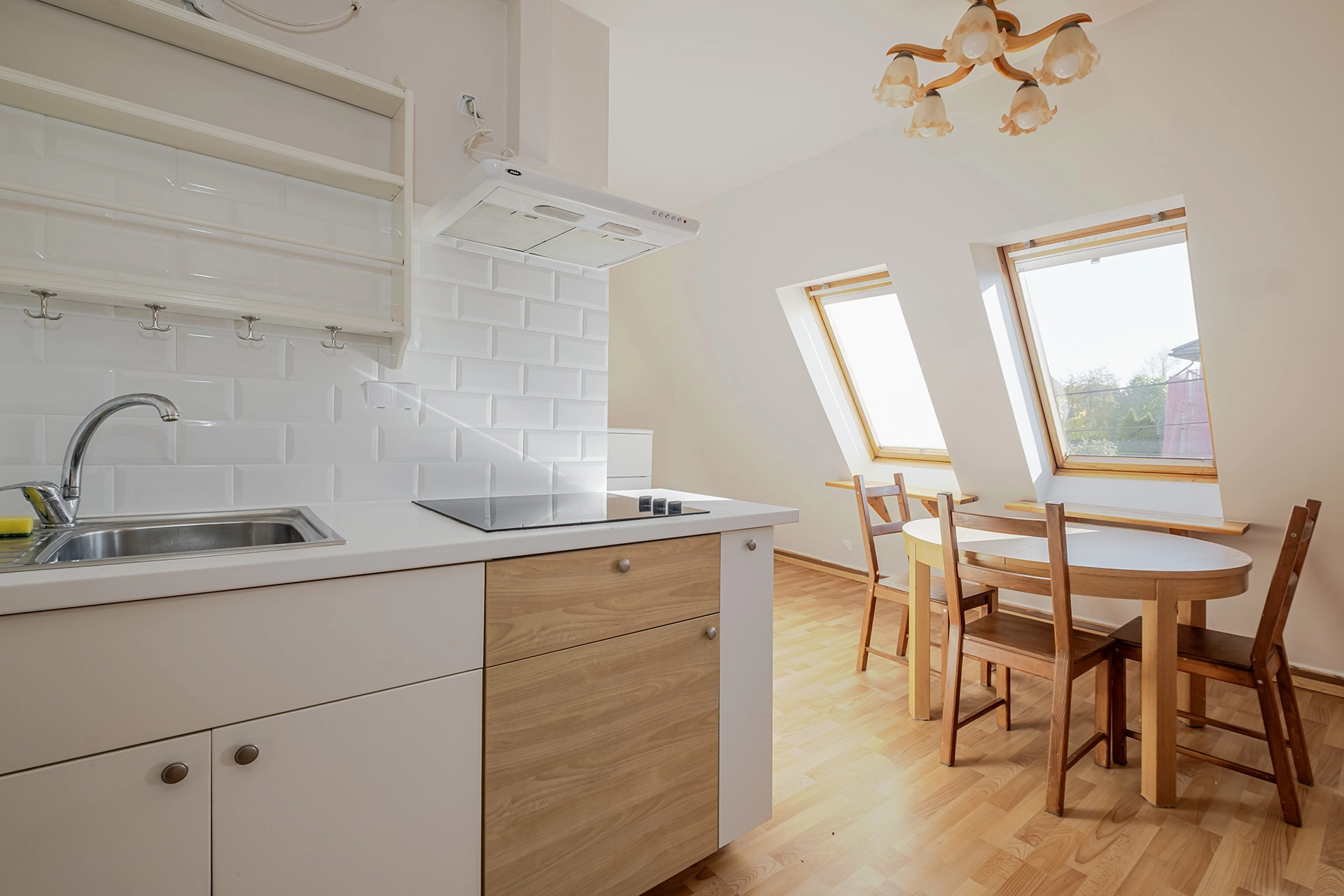 duży pokój z aneksem kuchennym oraz wydzieloną częścią sypialnianą i łazienką z prysznicem. Mieszkanie słoneczne z oknami dachowymi.